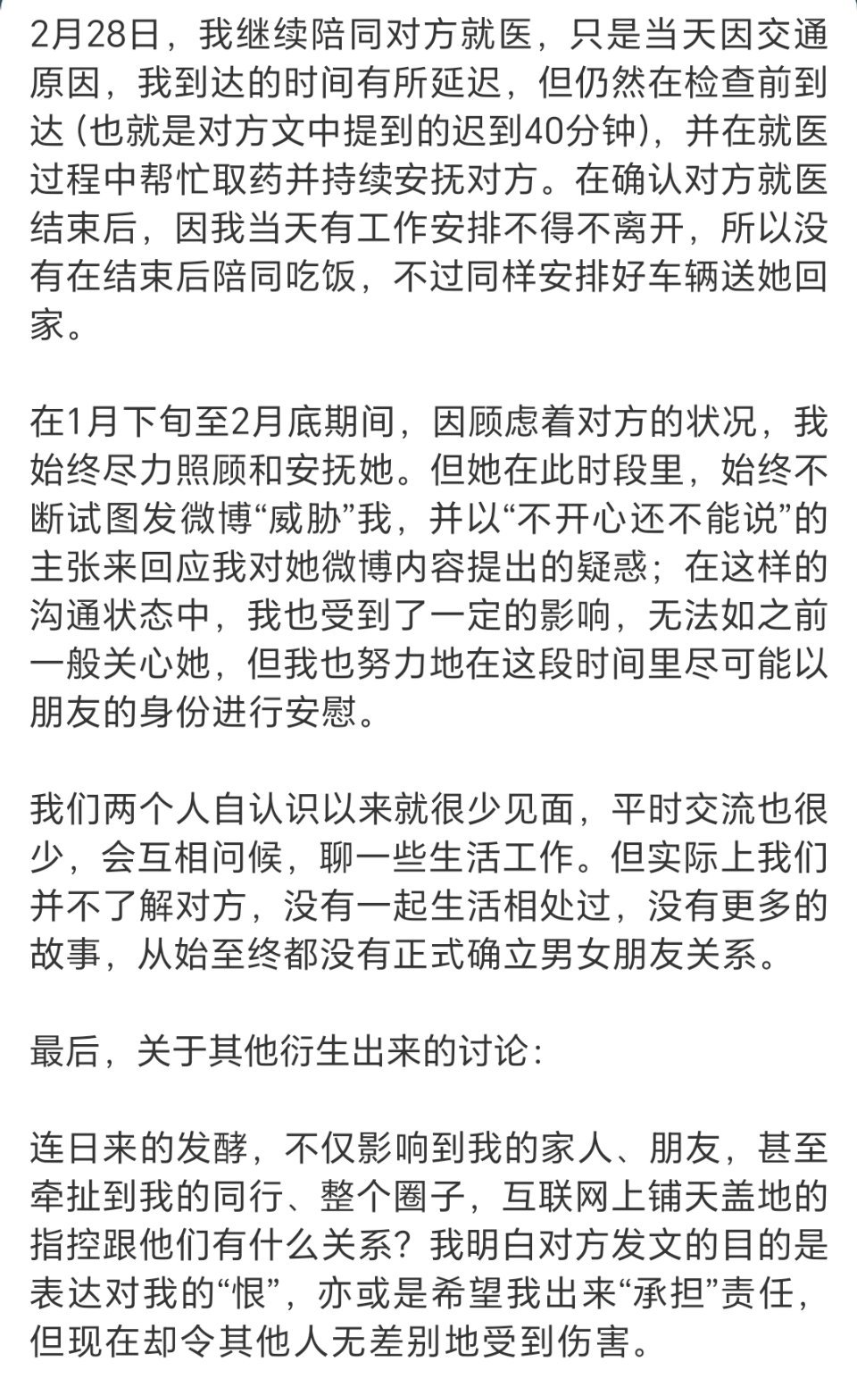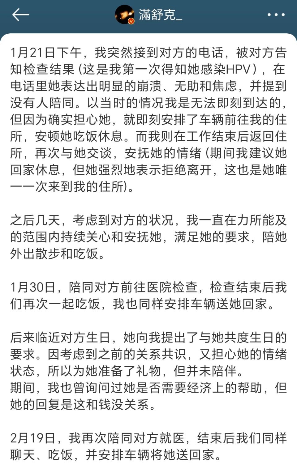 满舒克发文回应:表示两人非正式男女朋友,两人认识以来很少见面,并不了解对方,一直是以朋友的身份尽可能地给到对方照顾和安抚。还有被指控的“病情”提前不知情,也没有“恶意传播”,并对不陪伴就医等做出了情况说明。