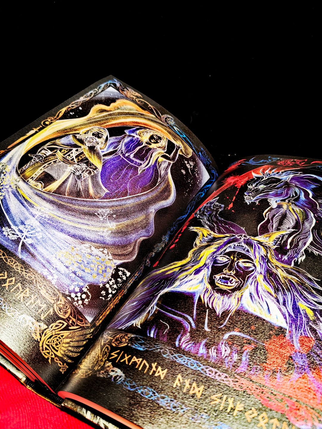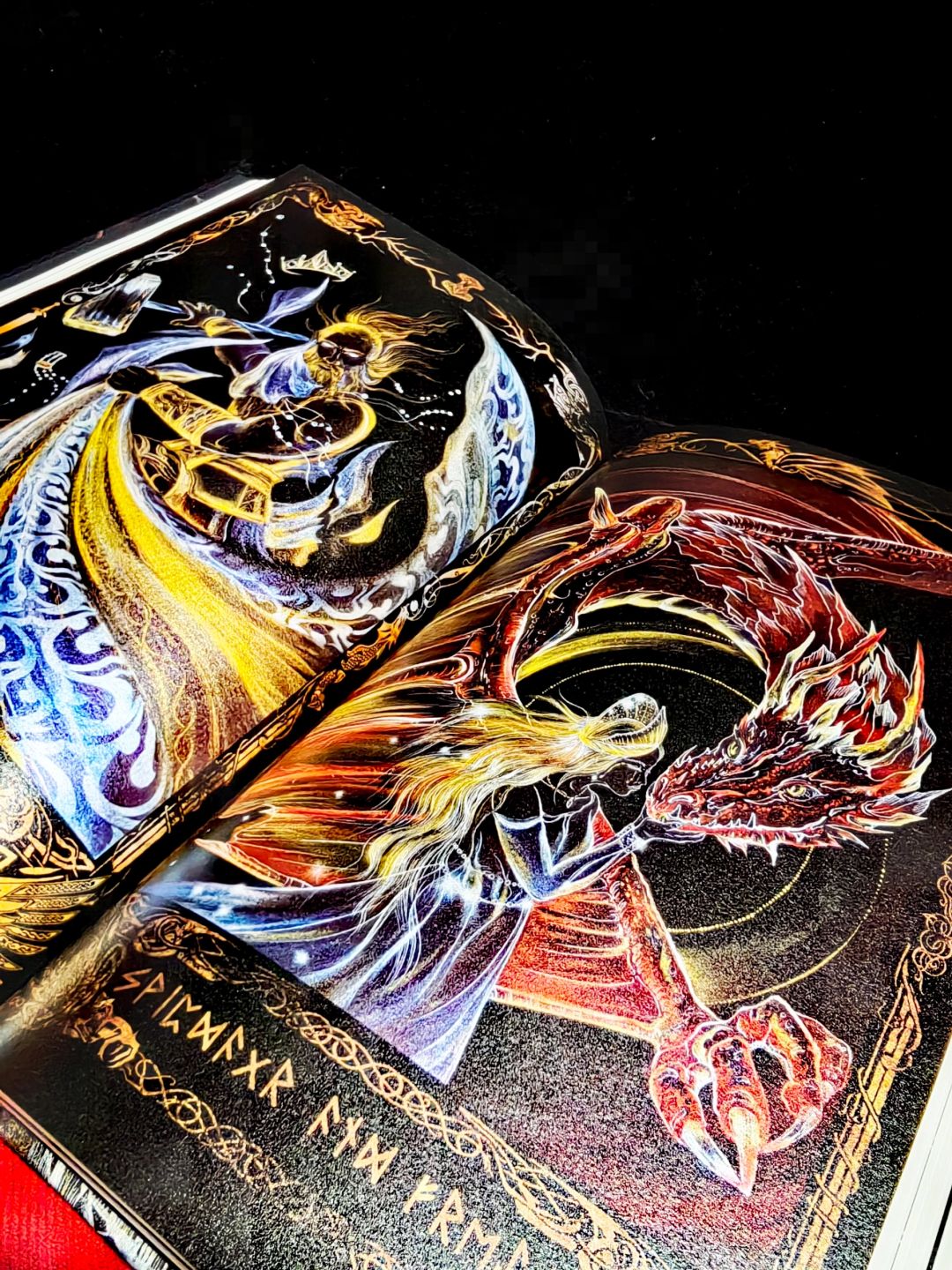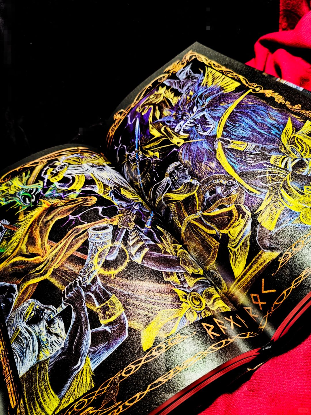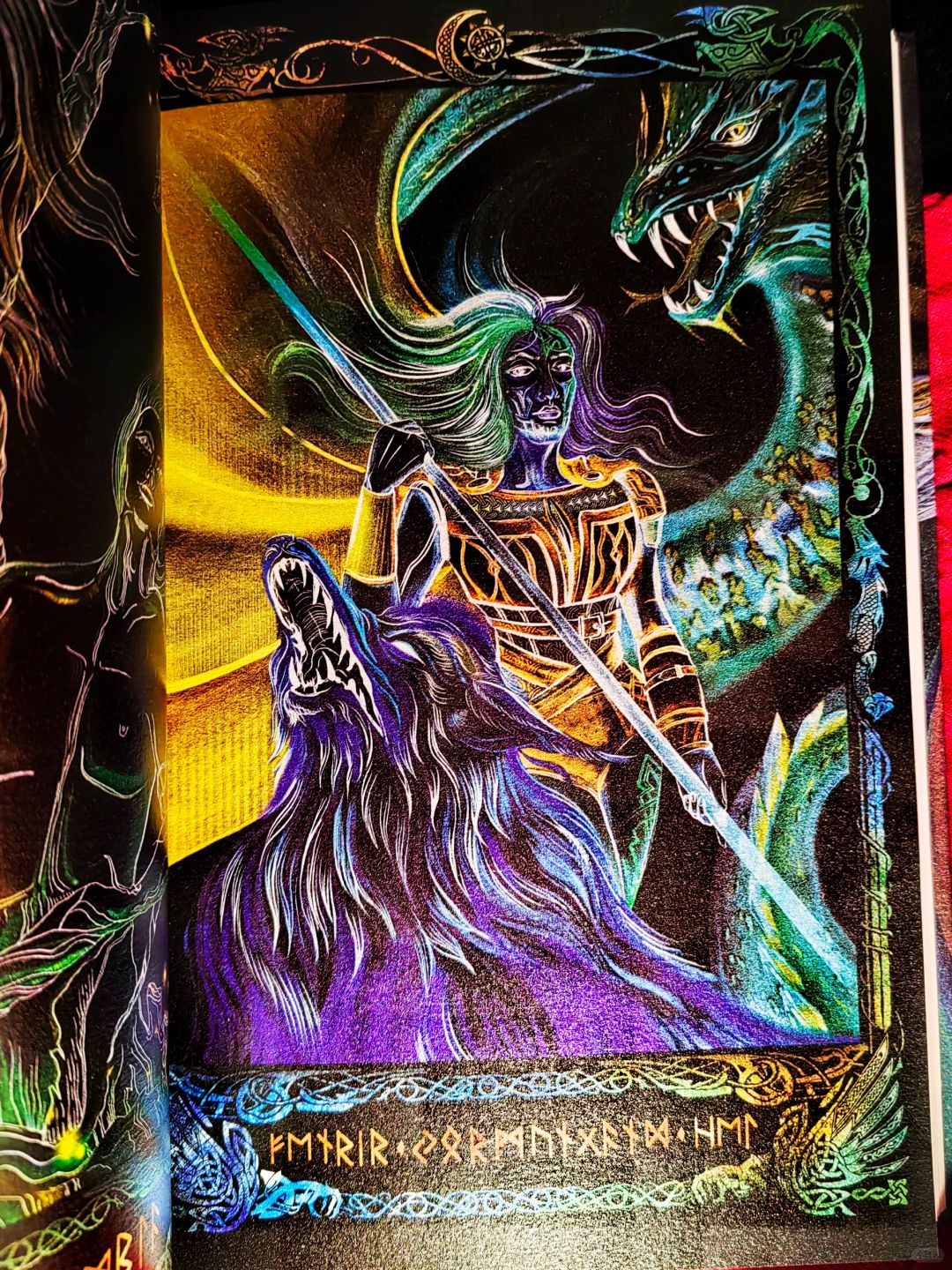 Zui令我惊叹的是在特种金属系银纸上,华丽丽呈现出来的诸神的冷峻与野性力量。灯光下每幅图闪耀如银箔,每一道五彩仿佛罩上了银月般的细闪质感。也只有这金属矿藏之色,才能够承载远古北欧神话的粗狂、古拙与冷冽的力量感吧!