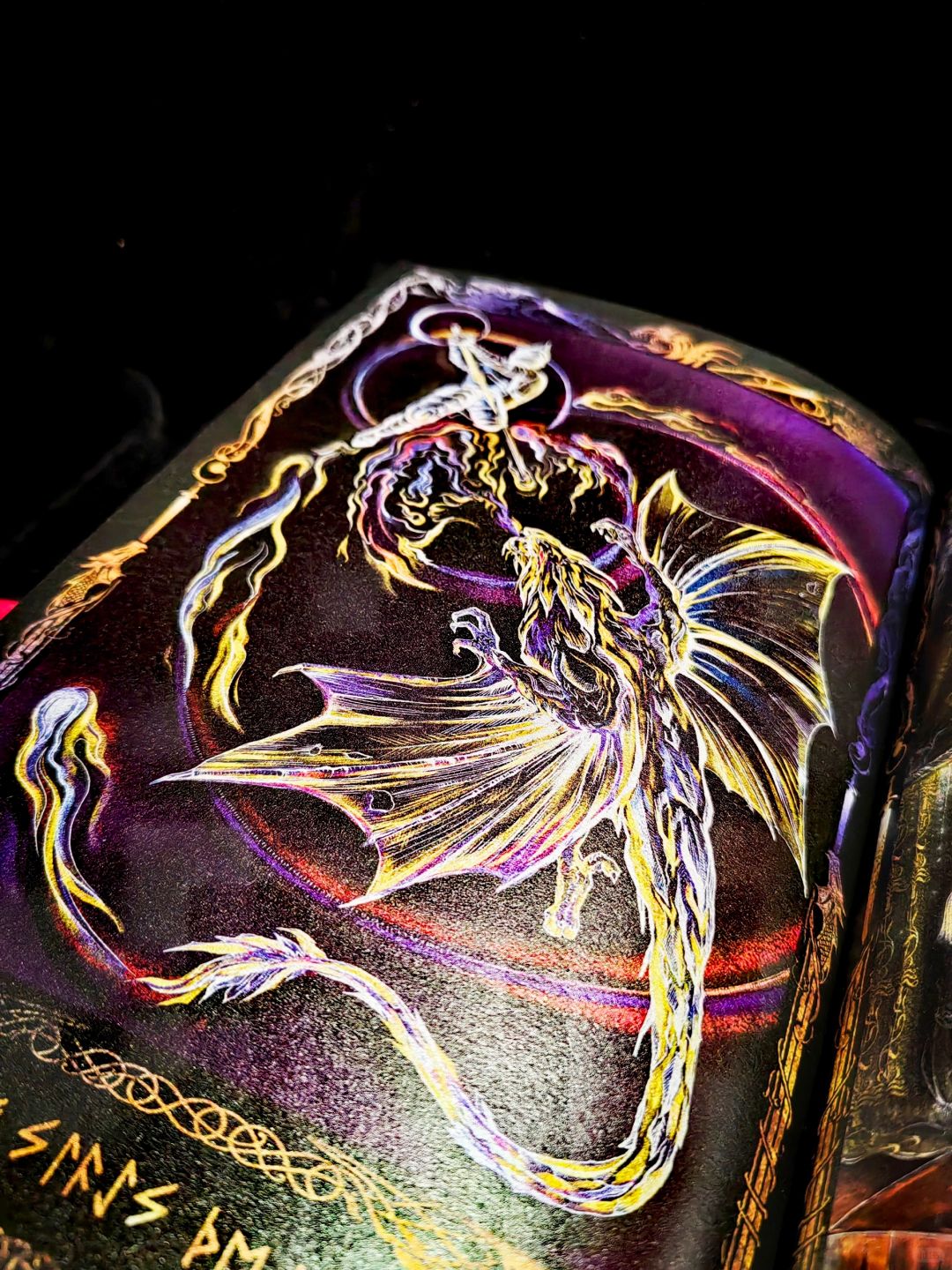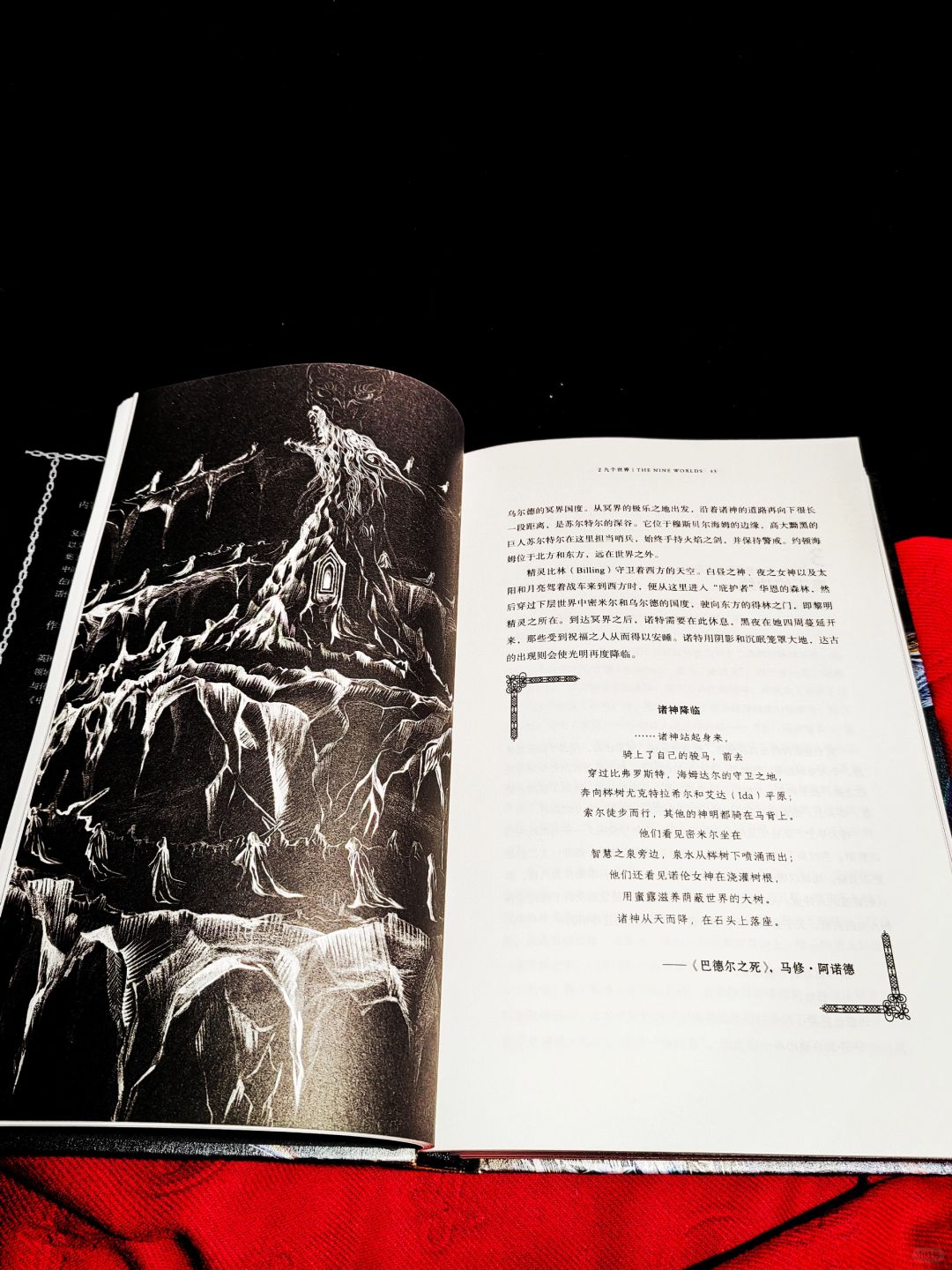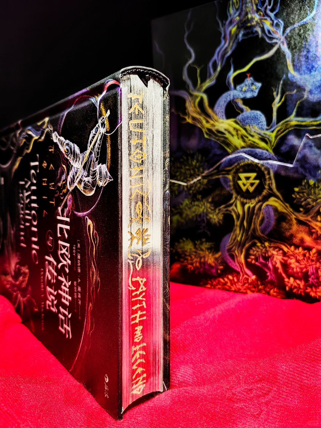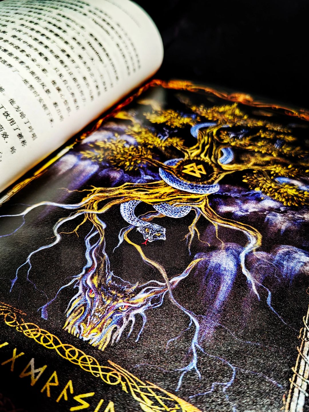 其次,仿卢恩符文刷银雕刻的书口也相当吸睛,字体的边缘呈现一种略带纹路的雕刻感,洋溢着北欧的粗狂与古朴。同时,卢恩符文也在插图中多次出现。