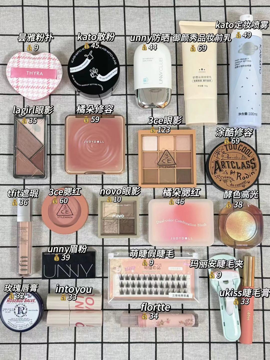化妆到现在也用了不少化妆品了,这些都是我积攒下来便宜好用的,有的回购好多次了,分享给姐妹们参考一下~ ❄unny防晒 ❄tfit遮瑕 ❄御颜秀品妆前乳 ❄橘朵修容 ❄酵色高光 ❄lagirl眼影 ❄萌睫假睫毛 ❄ukiss睫毛膏 ❄intoyou唇泥