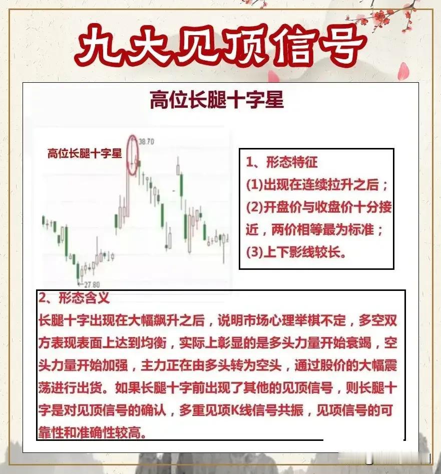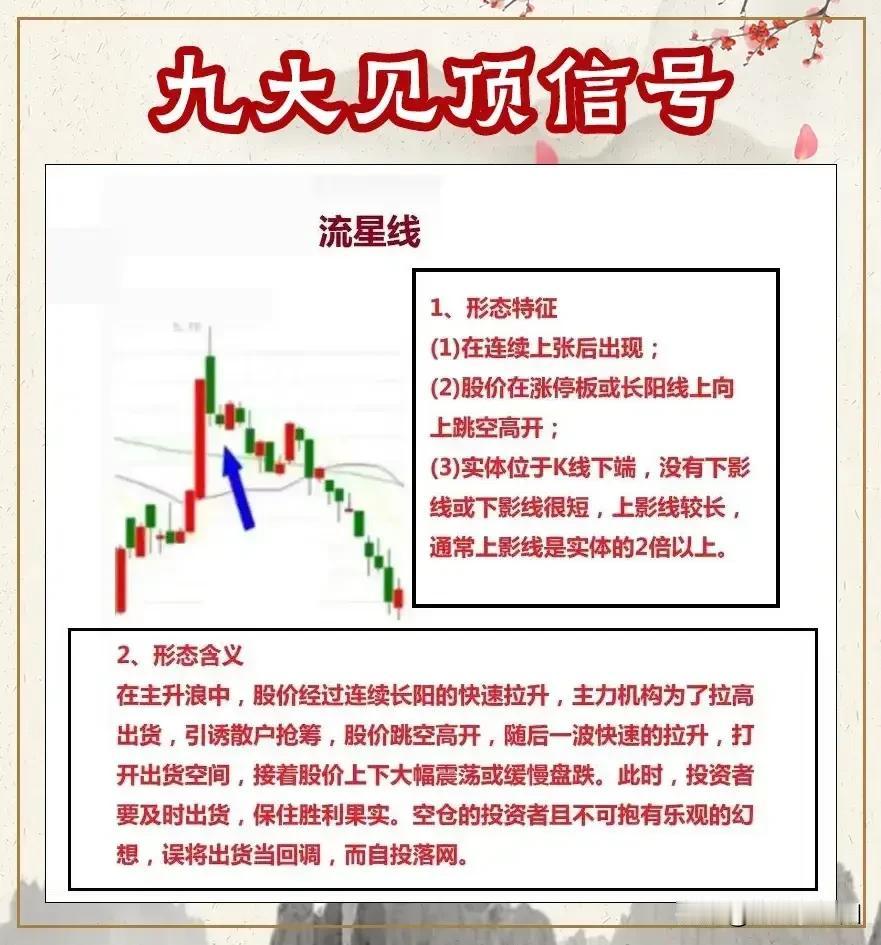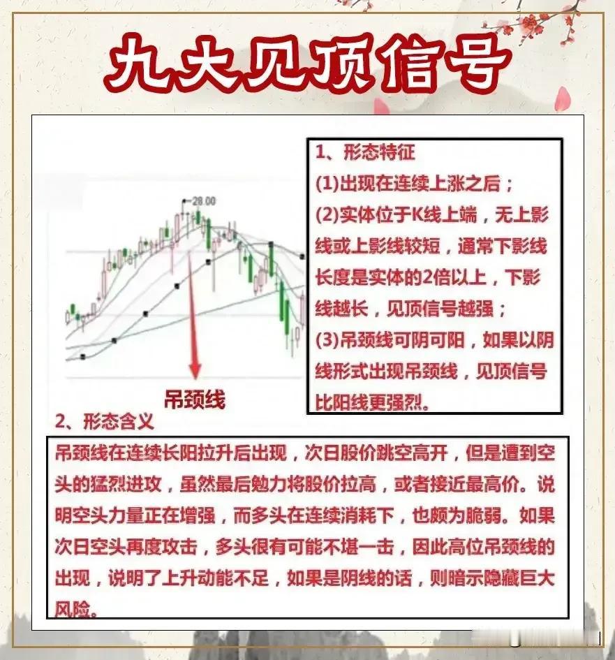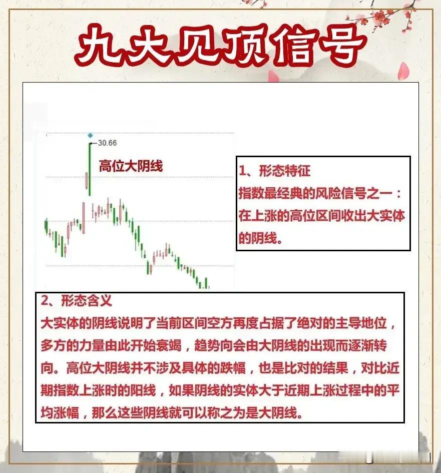 A股,不要只会埋头苦炒,一味往里冲,一定要注意个股见顶信号,及时回避风险。炒股锁住利润保住本金很重要,市场机会很多,可以再来。不要抱着侥幸结果套在顶部,更没必要一口气吃成胖子,把自己老是置于风险之中。 以下九大见顶信号,大家可以好好研究研究。觉得有帮助的也可以跟其他朋友一起分享。