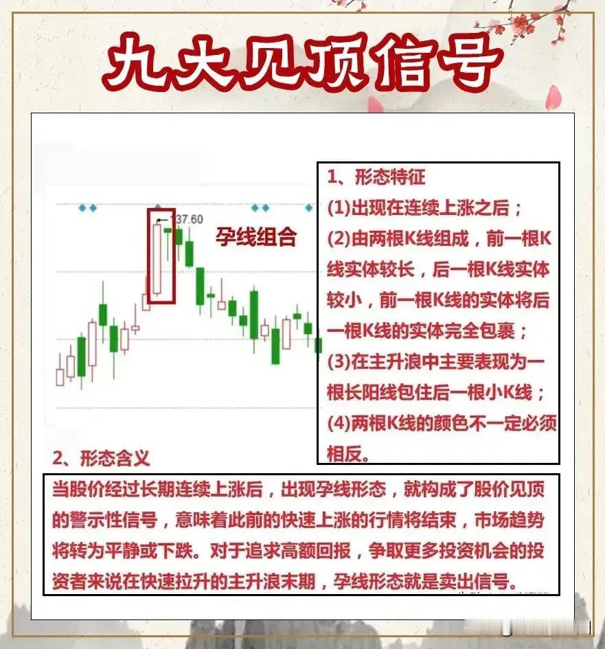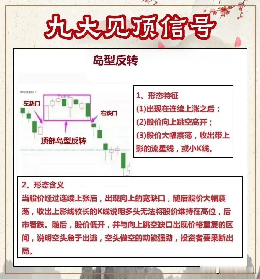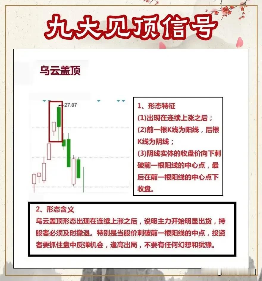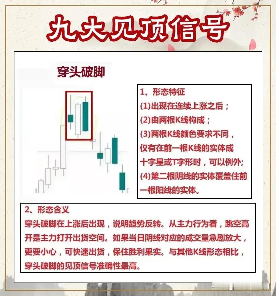 A股,不要只会埋头苦炒,一味往里冲,一定要注意个股见顶信号,及时回避风险。炒股锁住利润保住本金很重要,市场机会很多,可以再来。不要抱着侥幸结果套在顶部,更没必要一口气吃成胖子,把自己老是置于风险之中。 以下九大见顶信号,大家可以好好研究研究。觉得有帮助的也可以跟其他朋友一起分享。