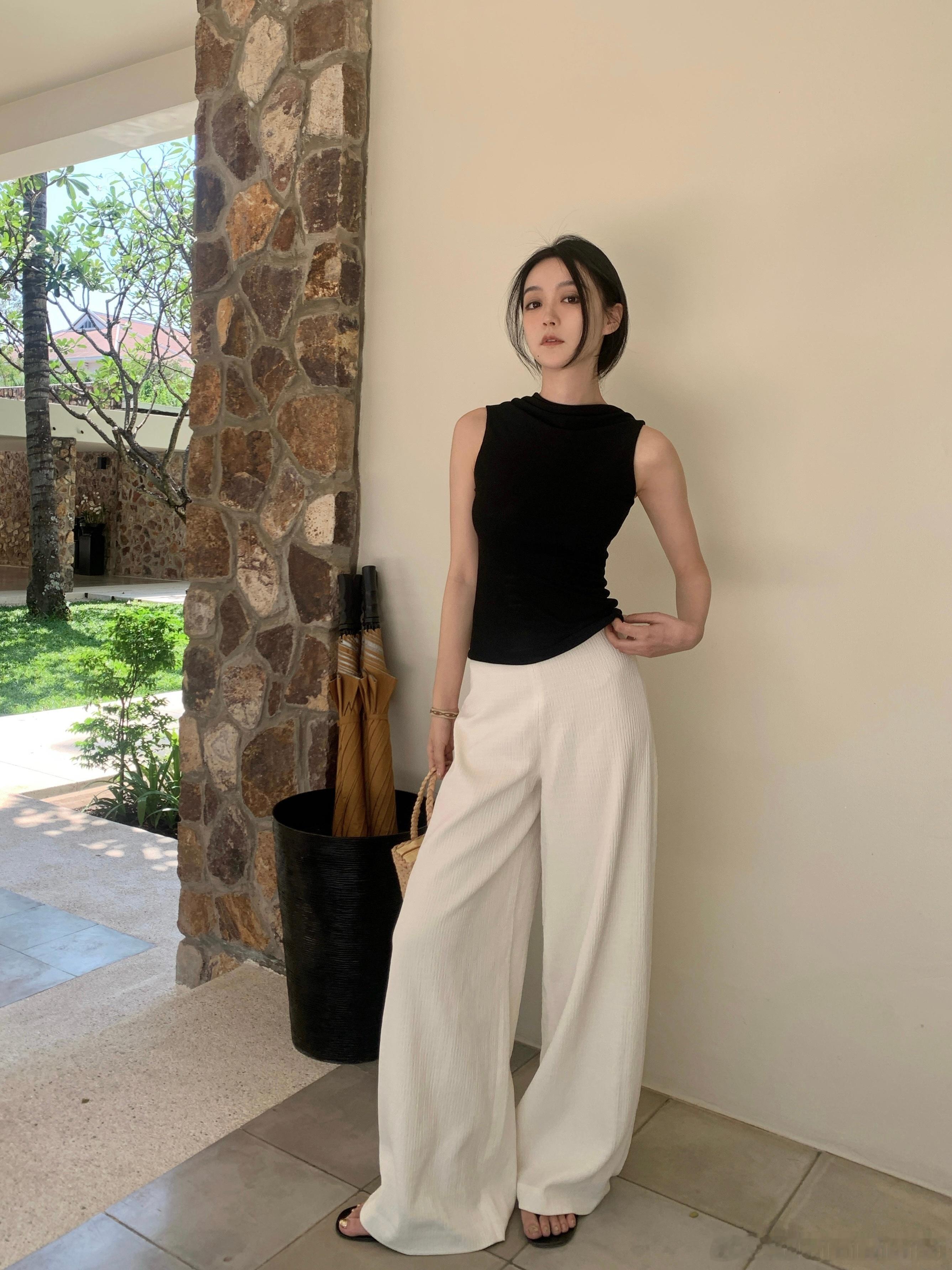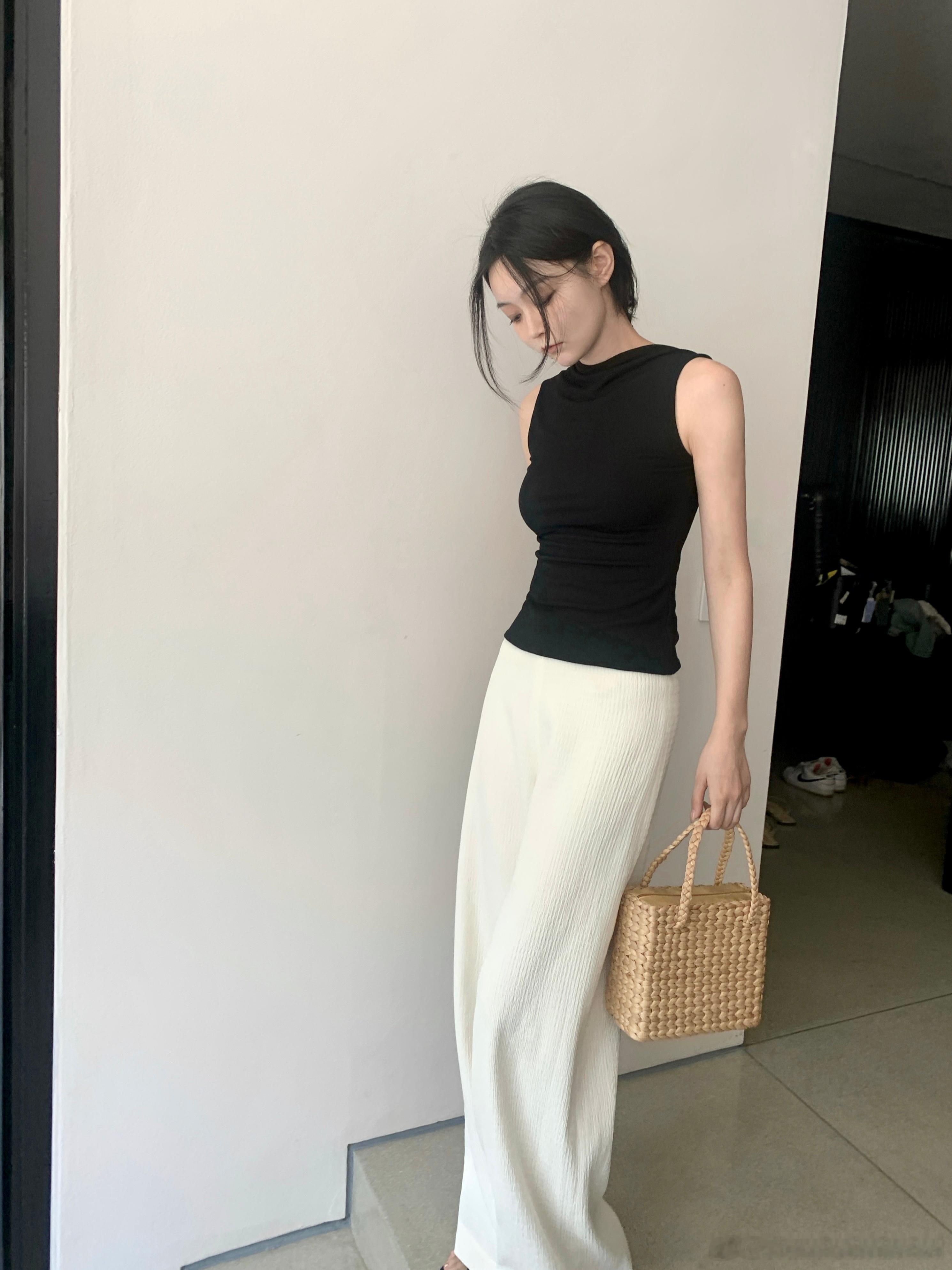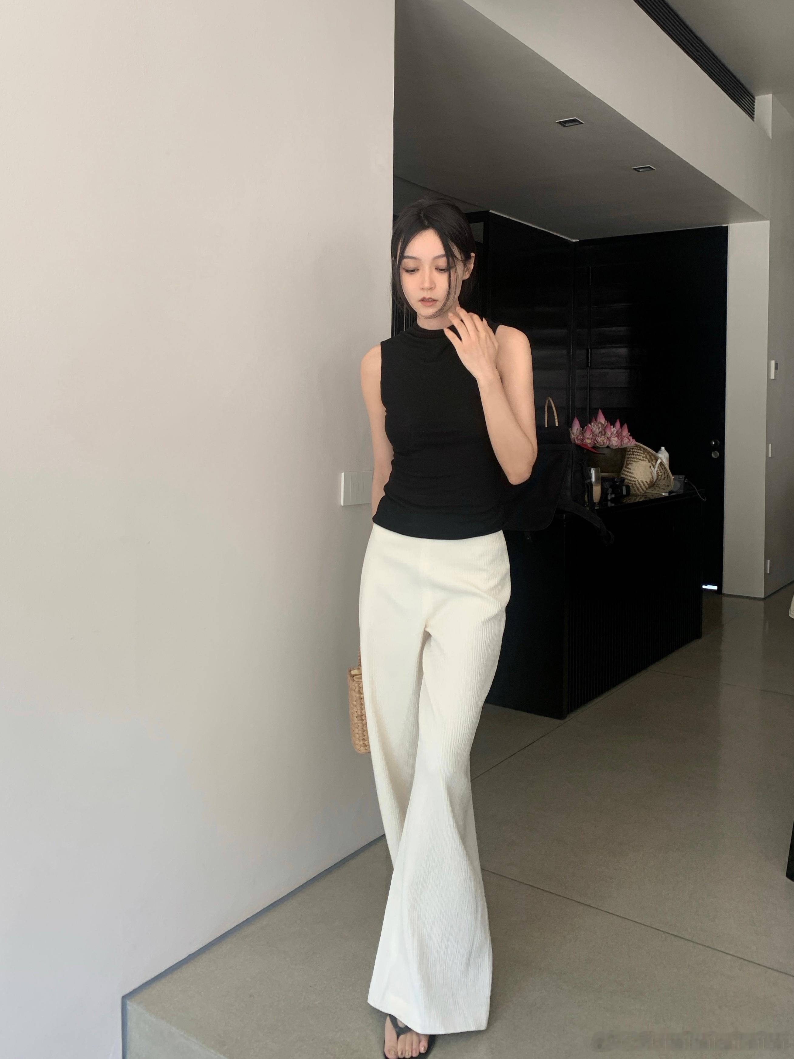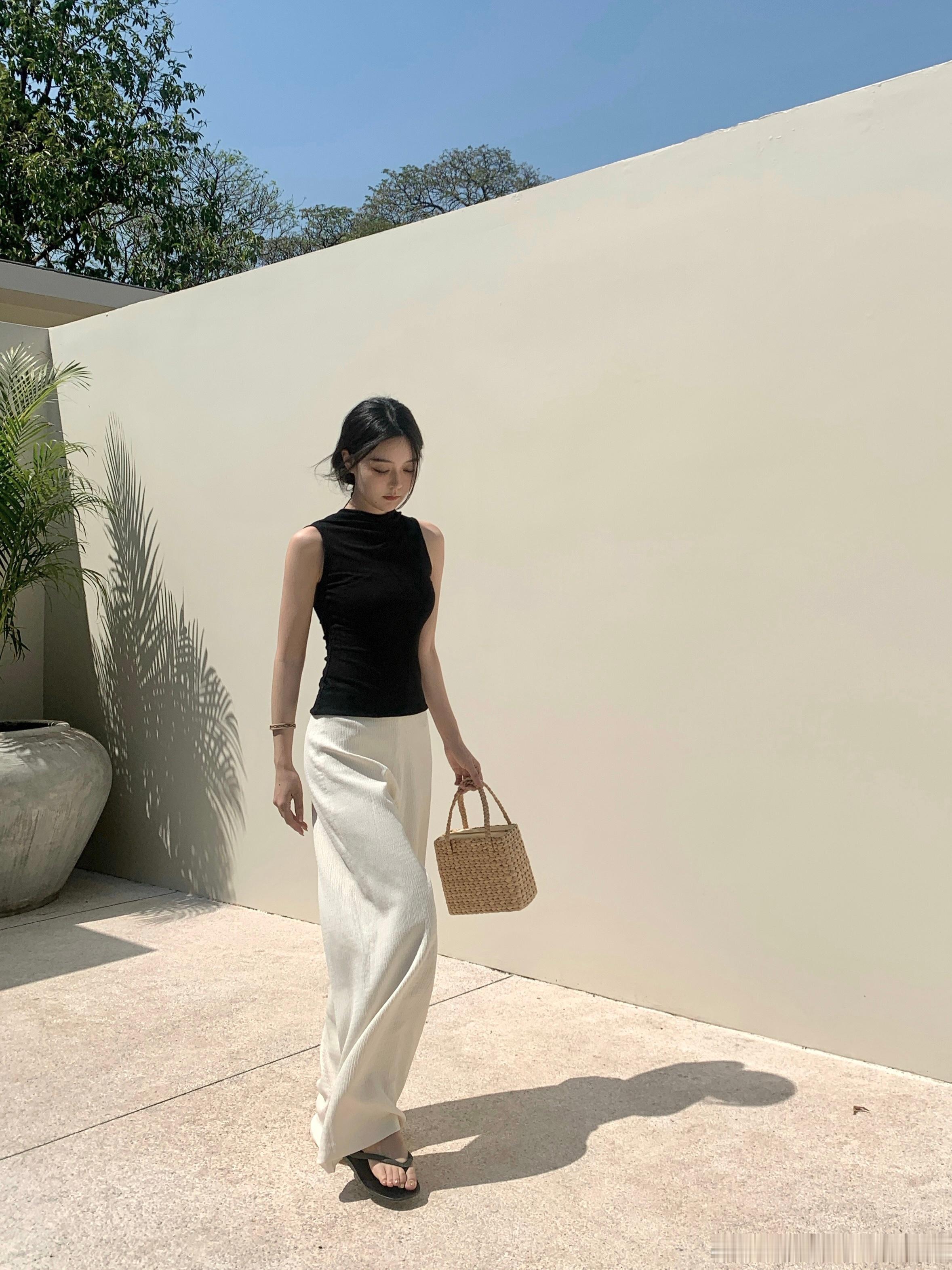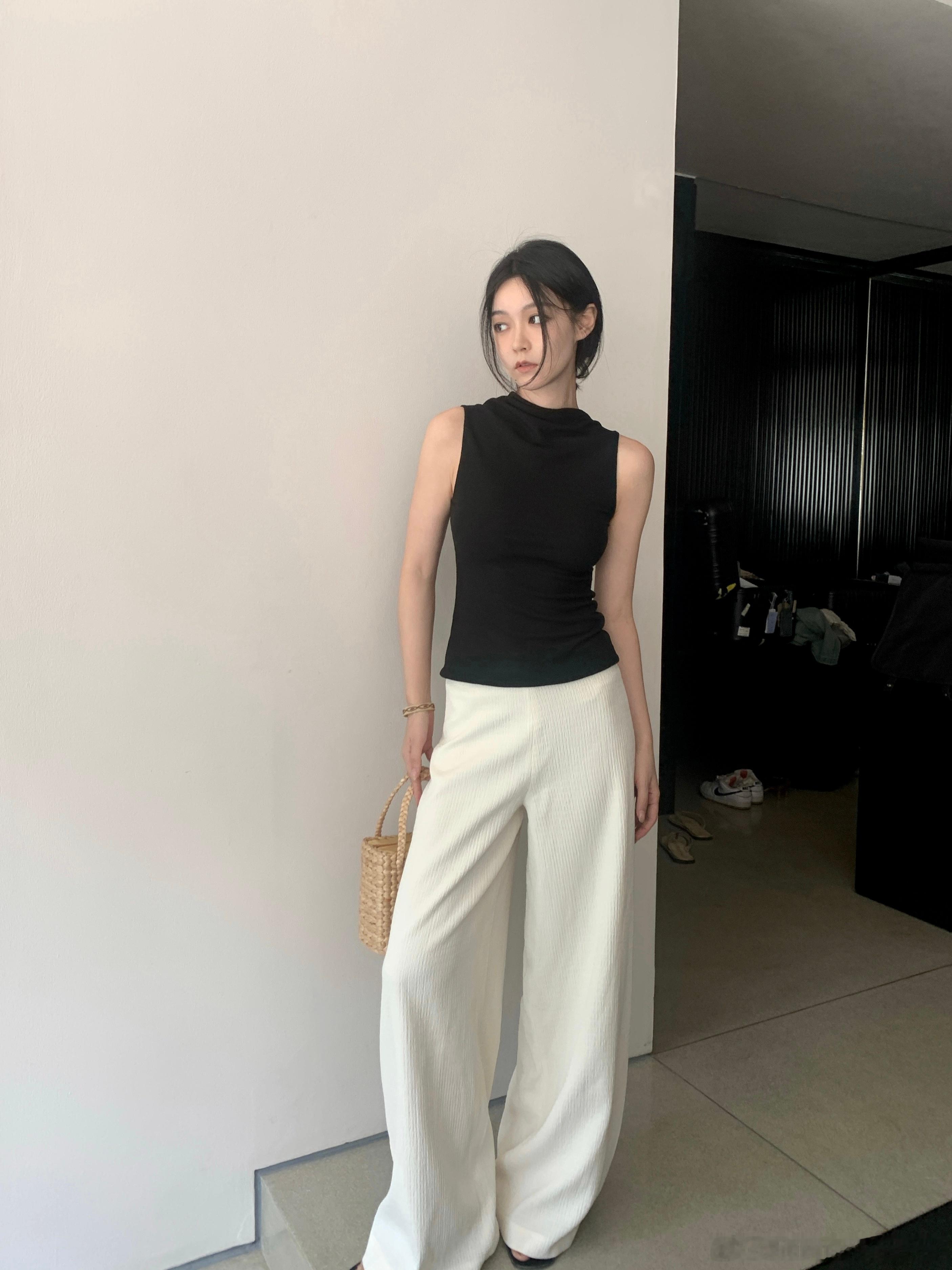 小高领 无袖的款式 准确来说是有一点儿小堆堆领的感觉 无袖腋下包裹部分也做得很好 遮副乳的