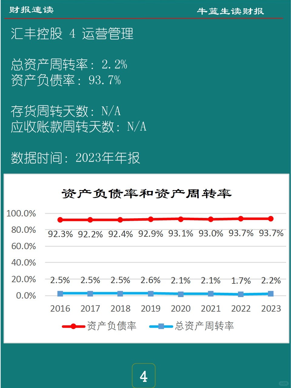-资产负债率93.7%,目前工行的资产负债率91.7%,相对而言中国大陆的银行更为稳健;总资产周转率2.2%。