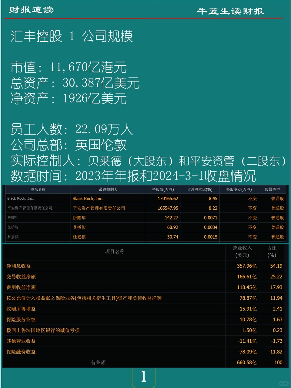 -汇丰控股的第1大股东是Black Rock,占比8.45%;第2大股东是平安资管,占比8.22%。