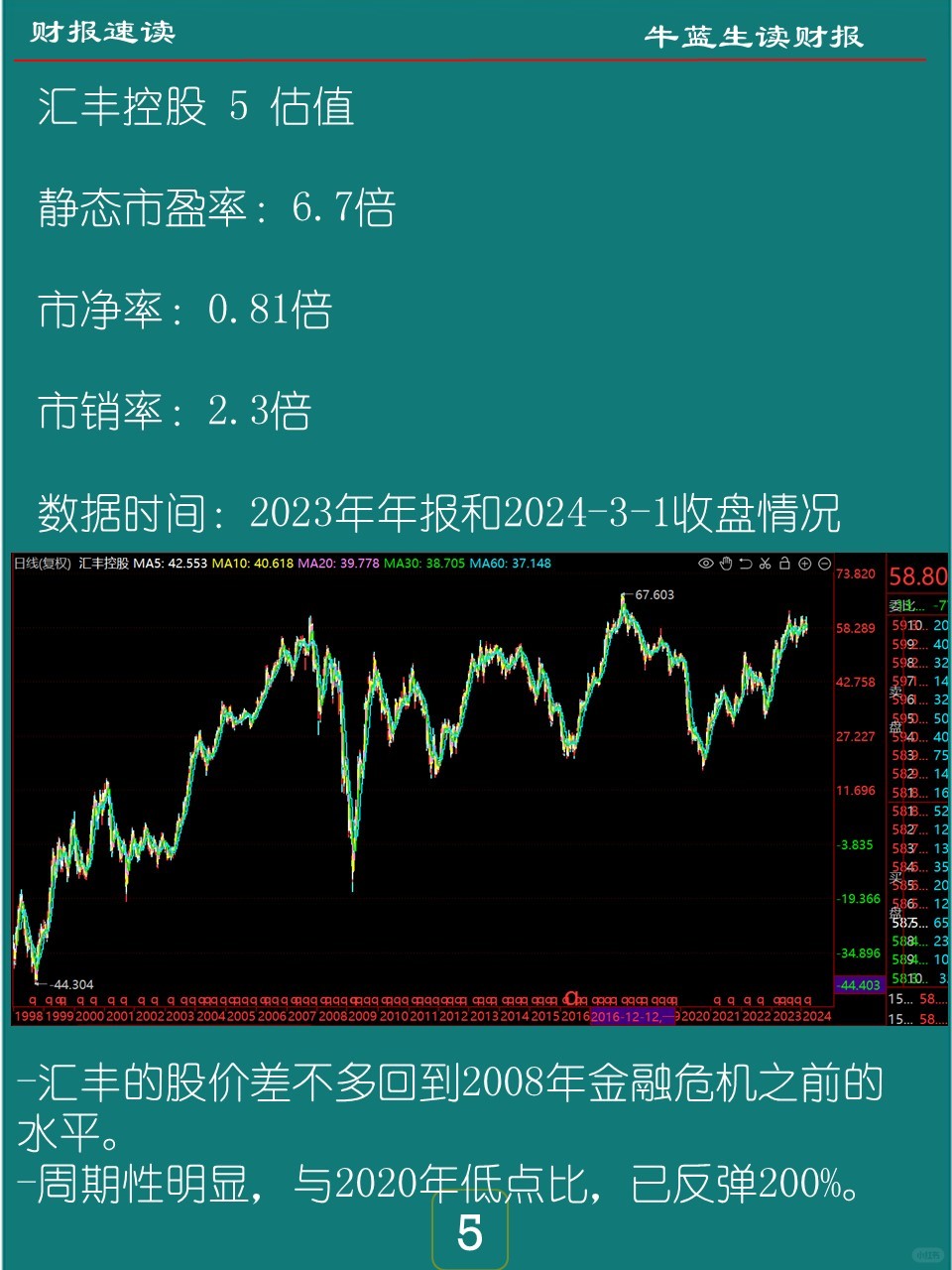 -2023年全年汇丰控股营收661亿美元,实现归母净利润224亿美元。相比2022年,营收和净利润分别增长30.5%和56.4%,业绩强劲反弹。2020-2022三年疫情期间,汇丰控股的营收略低于2019年,净利润则还不错,只有2020年较差。2020年的营业依然略低于2019年,但是净利润已经达到历史最好水平。