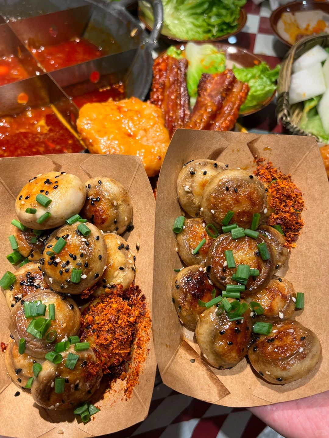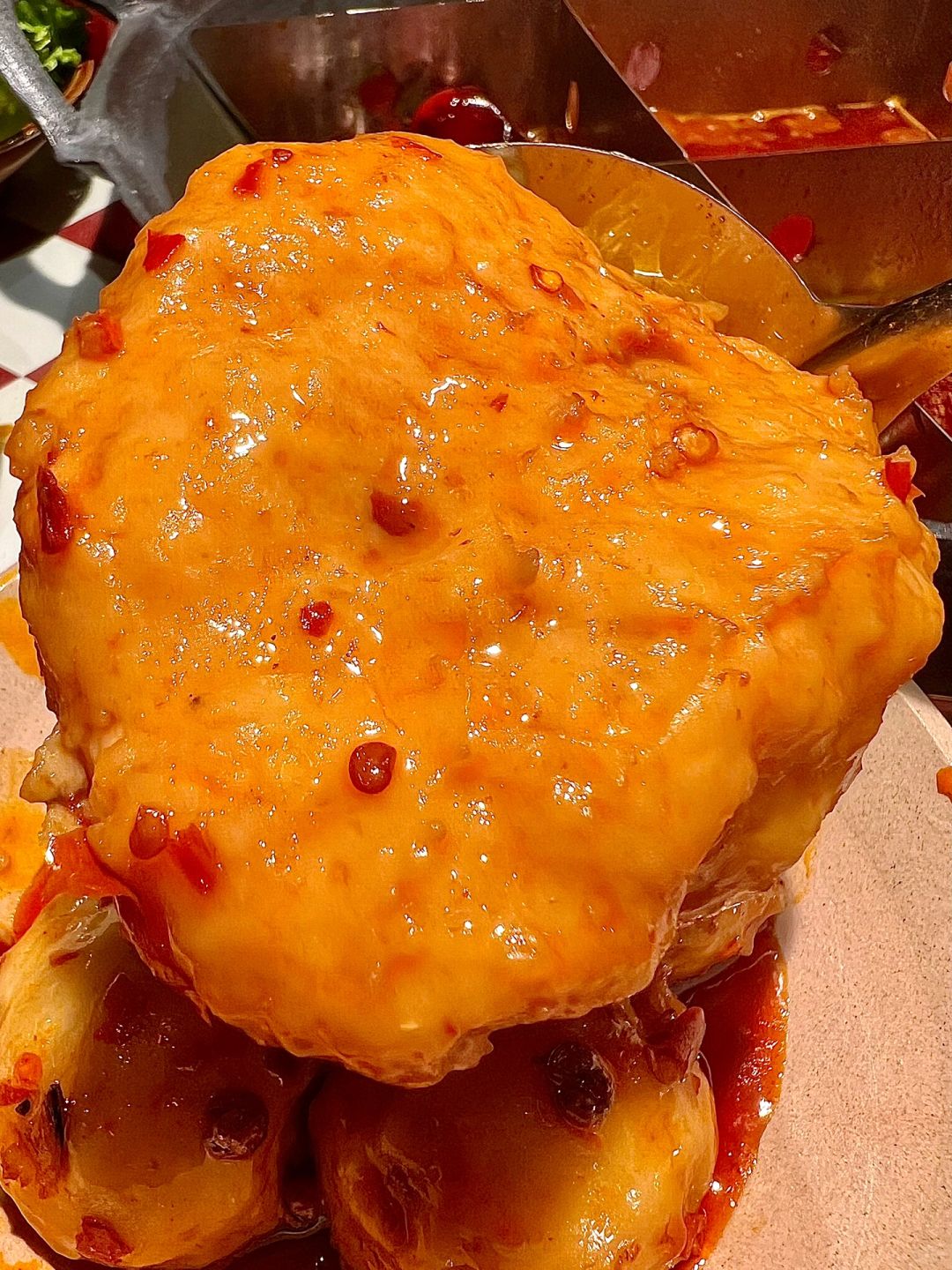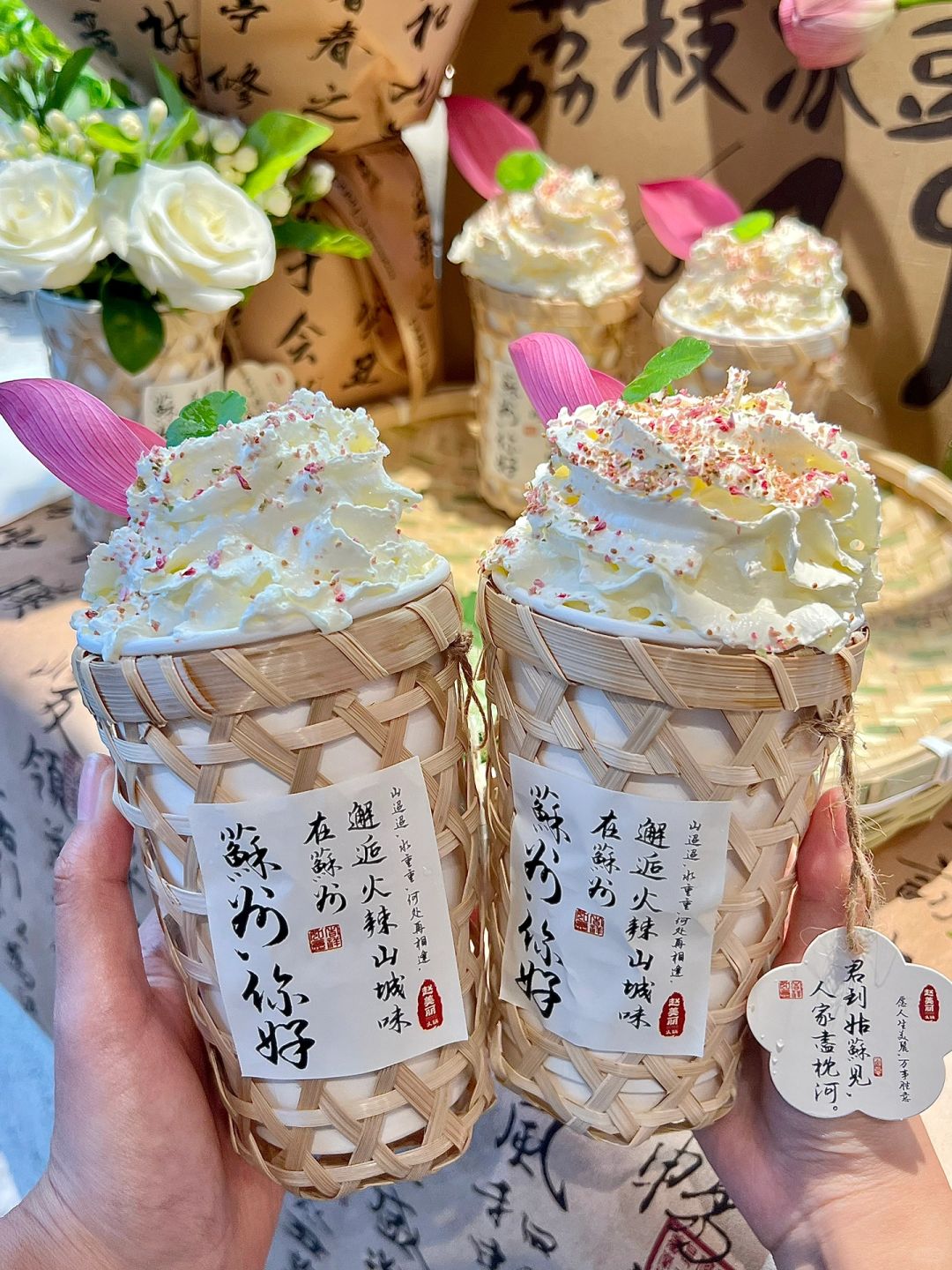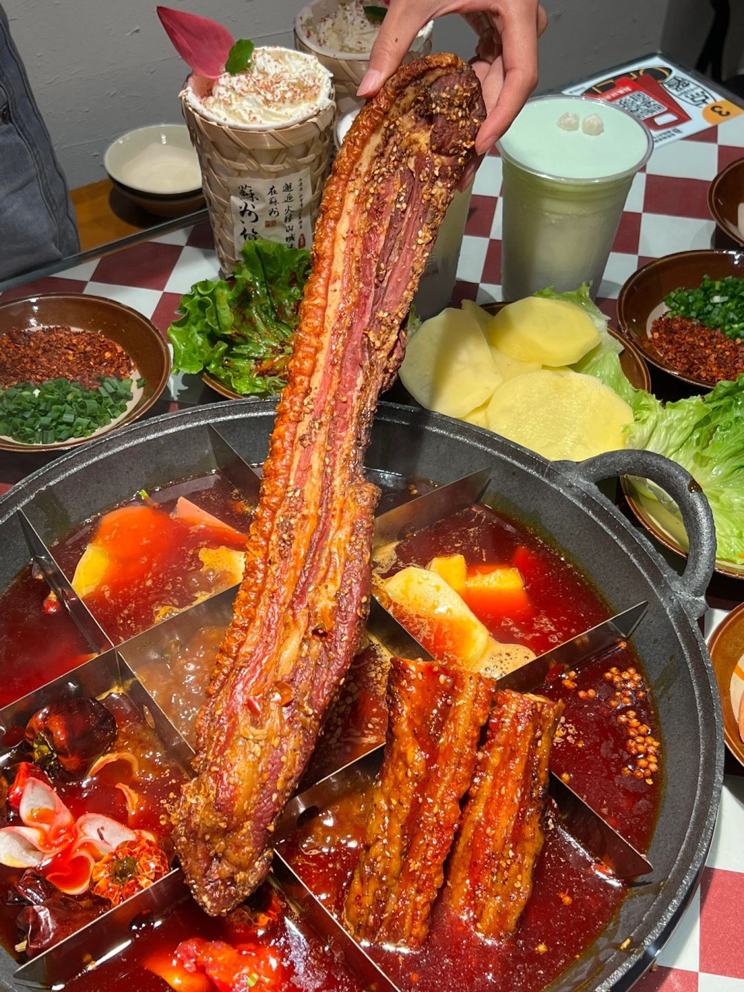 荷花饮品🪷芋泥桶每桌bi点!解辣!!! 点了个重油九宫格锅底,尊嘟好过瘾!! 涮进辣锅里,蘸油碟一个字爽!!!