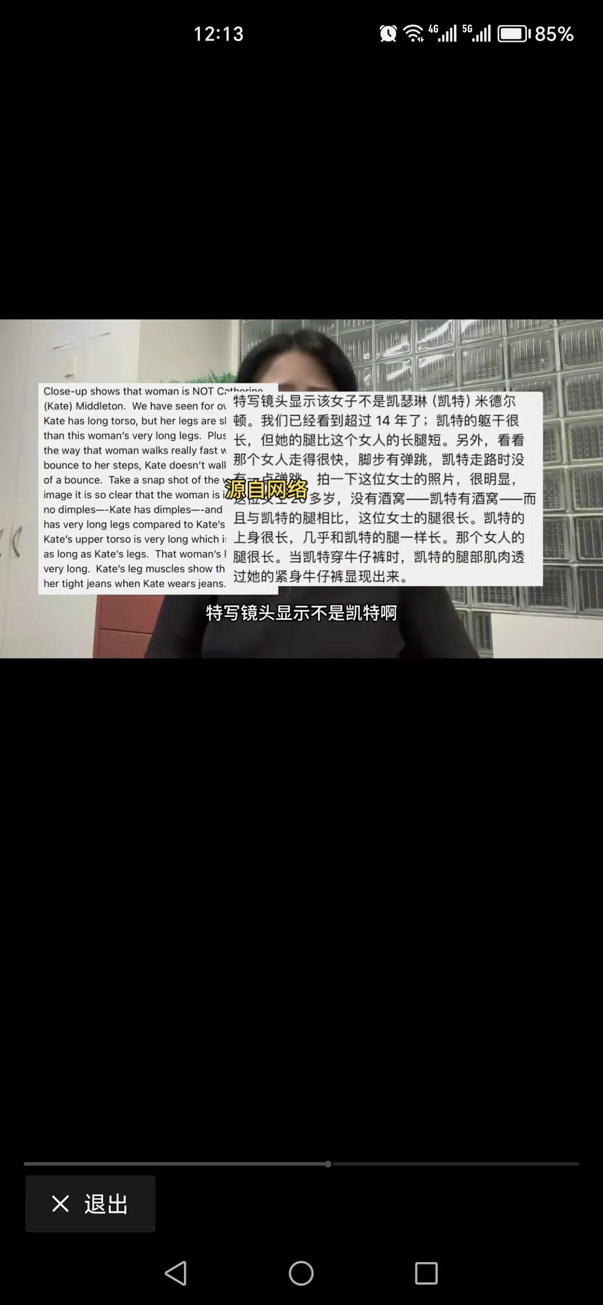 得了,外国网友也觉得英媒放出的最新视频里不是凯特,觉得那是假的,替身。 而且,因为英国人对凯特很熟悉,揪出很多细节来,比如: 凯特有酒窝,那个女人没有 凯特上身长,腿短,但视频里的女人腿长 凯特刚刚做完腹部手术,不可能拿着个大包还健步如飞 这个女人比凯特年轻20岁…… 总而言之……,全世界网友都觉得那不是真凯特… 所以,凯特到底去哪了? 难道真的上演了王室版“消失的她”?