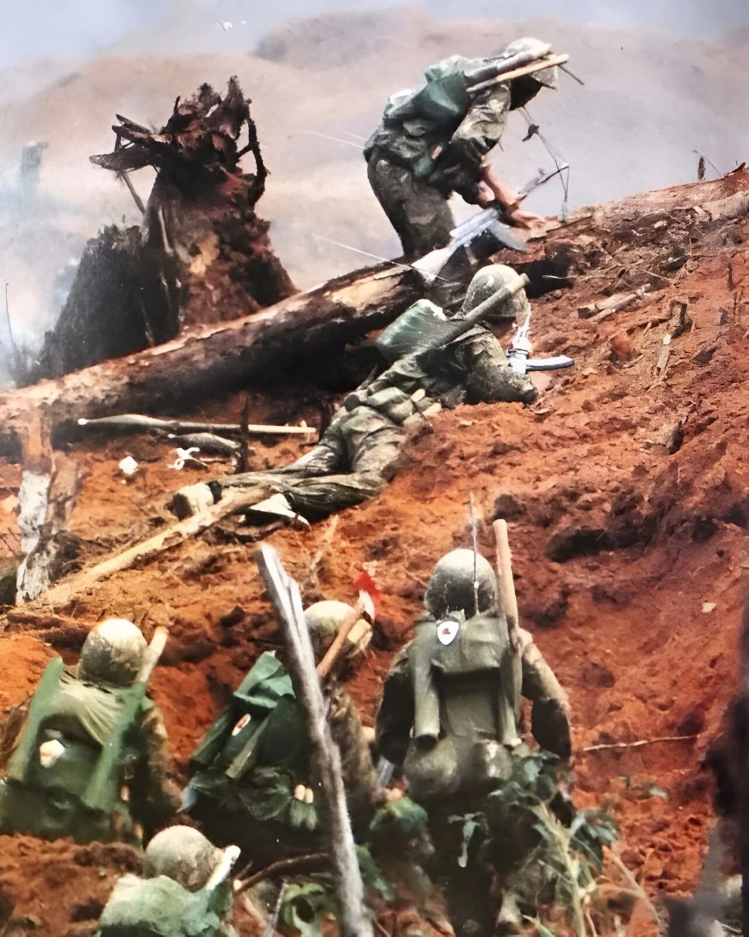 在这次行动中,突击队员扛着无后坐力炮和爆破索爬向山坡上的敌军阵地,并逐个炸毁越军的猫耳洞。