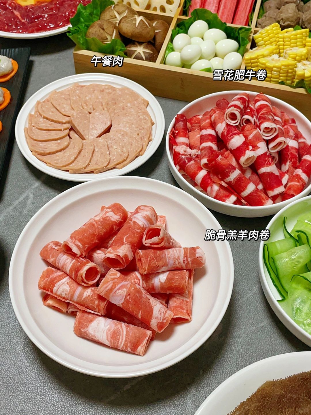 【荤菜】:雪花肥牛卷、羔羊肉卷、爽滑嫩牛肉、火焰牛肉片、脆骨羔羊肉卷、牛上脑片、毛肚、午餐肉