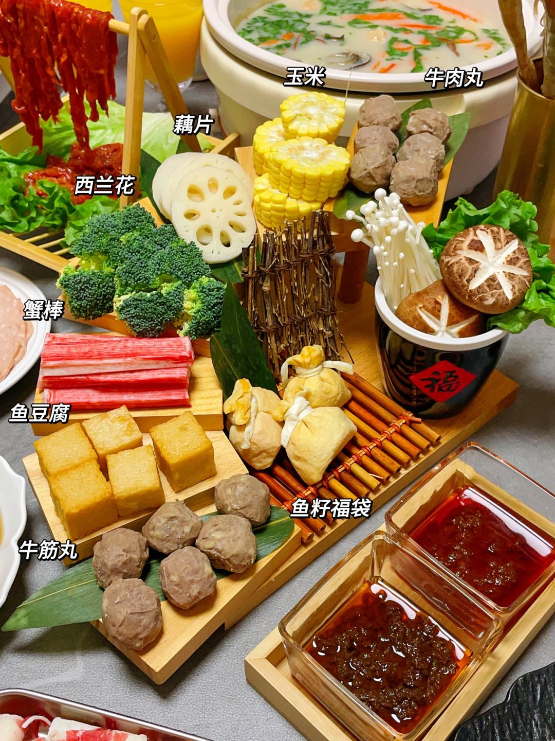 【素菜】:春笋条、藕片、豆皮卷、玉米、西兰花、茼蒿、生菜、盐水毛豆