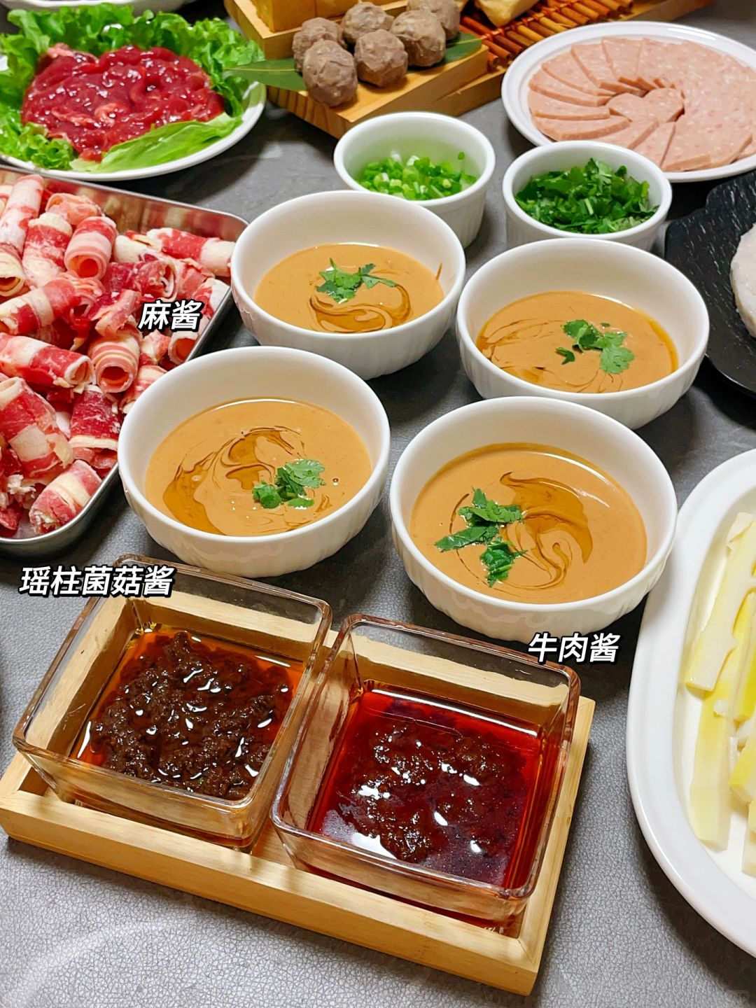 【火锅蘸料】:麻酱、牛肉酱、瑶柱香菇酱