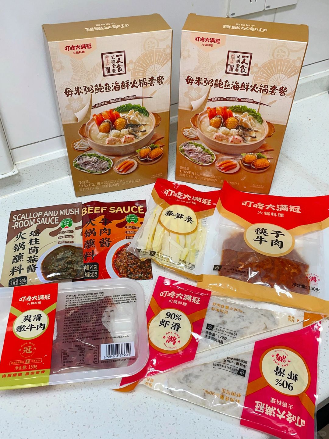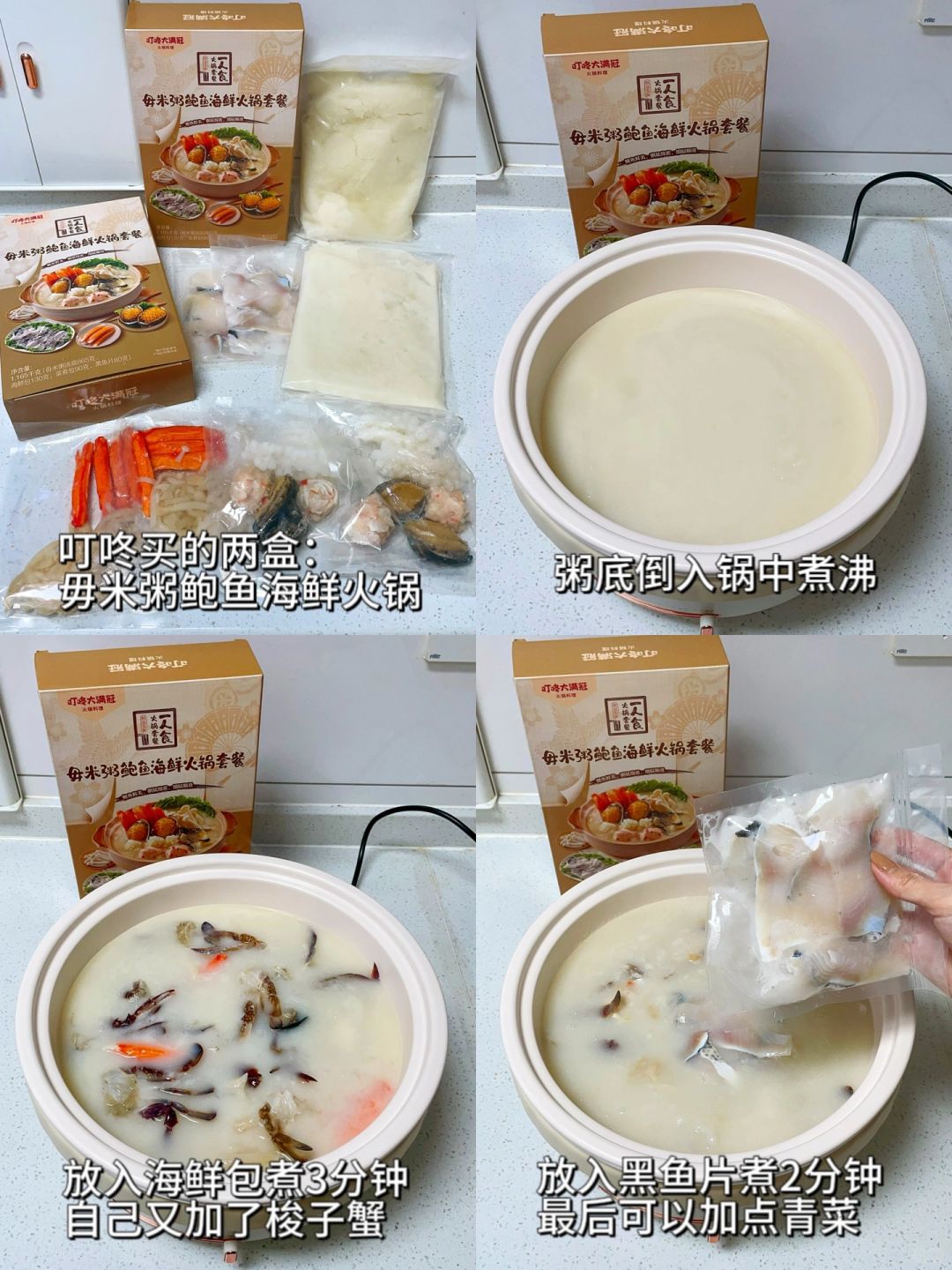 ❄️今天朋友来一起涮火锅,就想着吃点啥和平时不一样的。翻了翻叮咚买菜,看到正好有“叮咚咕嘟咕嘟火锅大会”,上面有好多口味的火锅锅底和火锅食材、蘸料。今天选了有广东地道特色的毋米粥鲍鱼海鲜火锅,是即能当海鲜粥喝也能涮火锅的那种,怕不够吃买了两大盒,几个人吃的相当满足。米浆粥底非常鲜美,里面还带有黑鱼片、鲍鱼、鱿鱼花、蟹味柳、龙虾味球和白玉菇。操作简单几分钟就能得到一锅正宗的粥底锅。喝完粥根据自己喜好可以煮海鲜和肉。今天的牛肉、虾滑和一些蔬菜也是在叮咚一起采购的,味道都不错。冬天聚餐火锅局,真的是简单又满足[集美R]