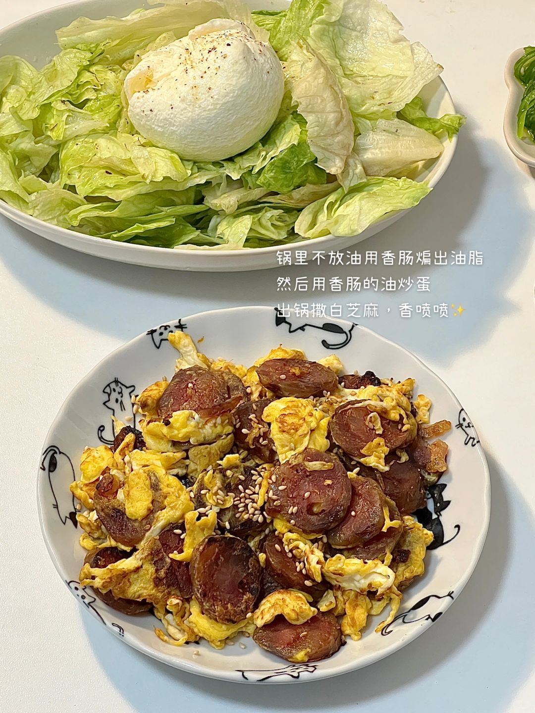 今日菜单: ·布拉塔沙拉 ·腊肠炒蛋 ·中华海草 - 生菜搭配布拉塔比青提、番茄都要好吃欸! 淋一圈油醋沙拉汁和橄榄油,再撒一些黑胡椒海盐 布拉塔用的是水牛牌滴!奶味超级浓郁~ 最后是我画滴小漫画 解释一下,关于我晚上不吃主食这件事儿 哈哈哈哈哈哈