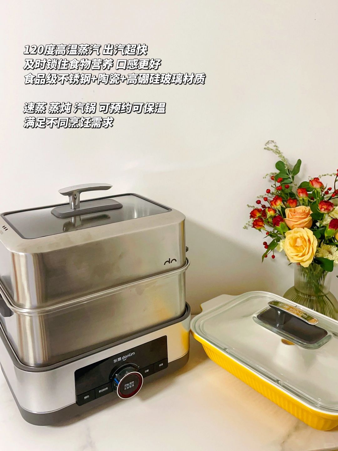 一套电蒸锅是由汽锅和双层蒸锅组成的,汽锅烹饪不用加一滴水,水蒸汽满满凝结成一锅汤,少油少脂,汤汁原汁原味,家里老人小孩都爱喝。蒸锅上汽速度很快,120度高温蒸汽,能快速锁住食材营养今天的鲈鱼蒸了7分钟刚刚好,口感真的很嫩!双层容量轻松满足四口之家,同时多个菜也能一锅出。锅体的卫生死角很少,还有自清洁提醒功能,全身都是可食用级不锈钢材质,清洗起来很方便,有宝宝的家庭也能完全放心用。今天用它做的几个菜,家里人都说味道好[赞R]