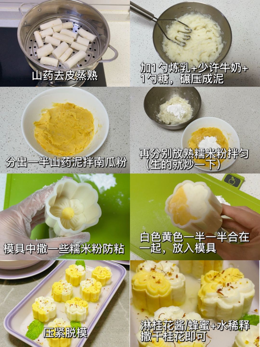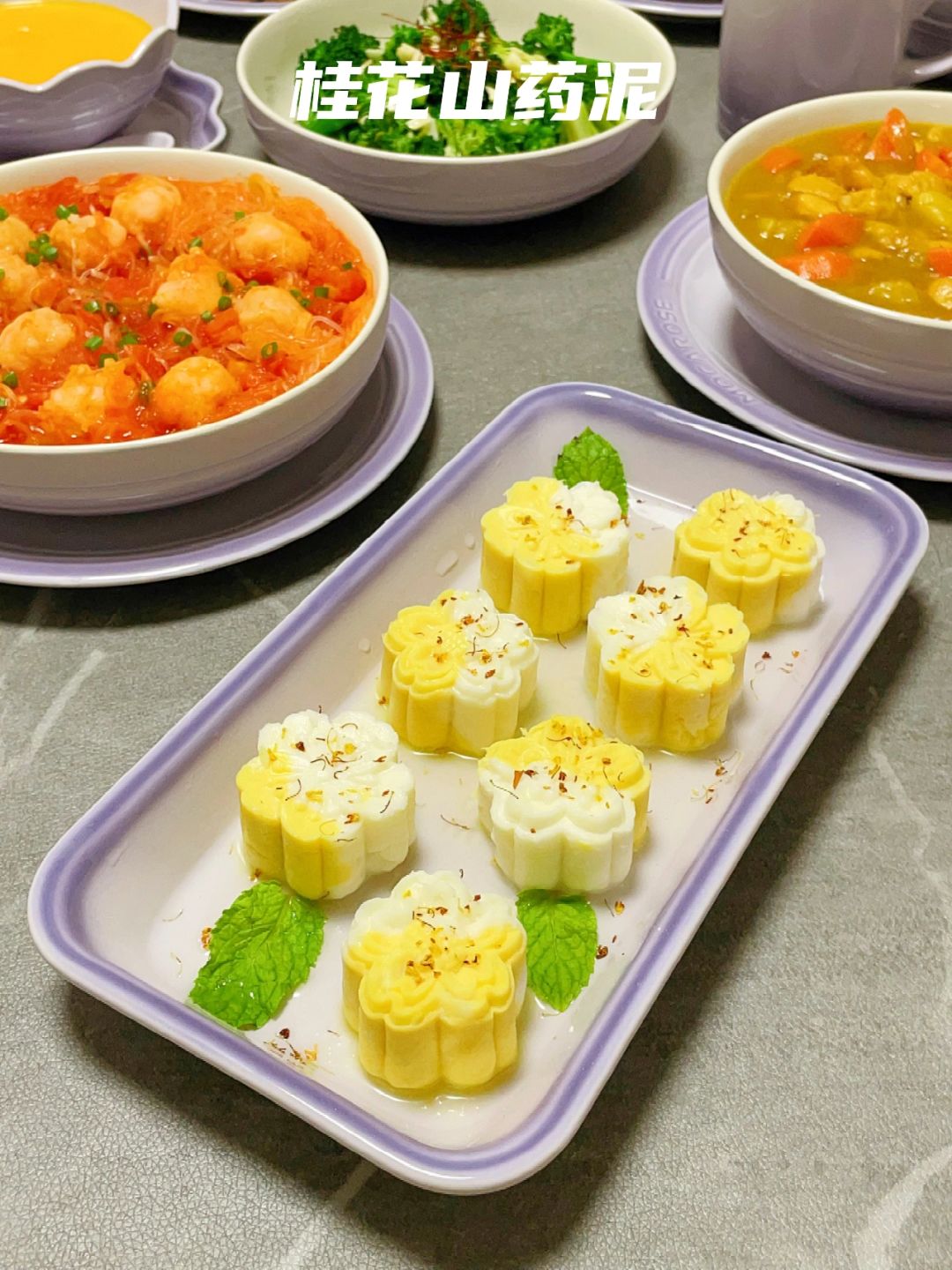 ✅桂花山药做过好几次啦,也得到很多小仙女的喜爱。今天搭配紫色盘子再来一次、真的好好看呀!注意蒸好的山药一定晾凉再压模,糯米粉要用熟的。最后淋桂花酱/蓝莓酱/草莓酱什么的都行。