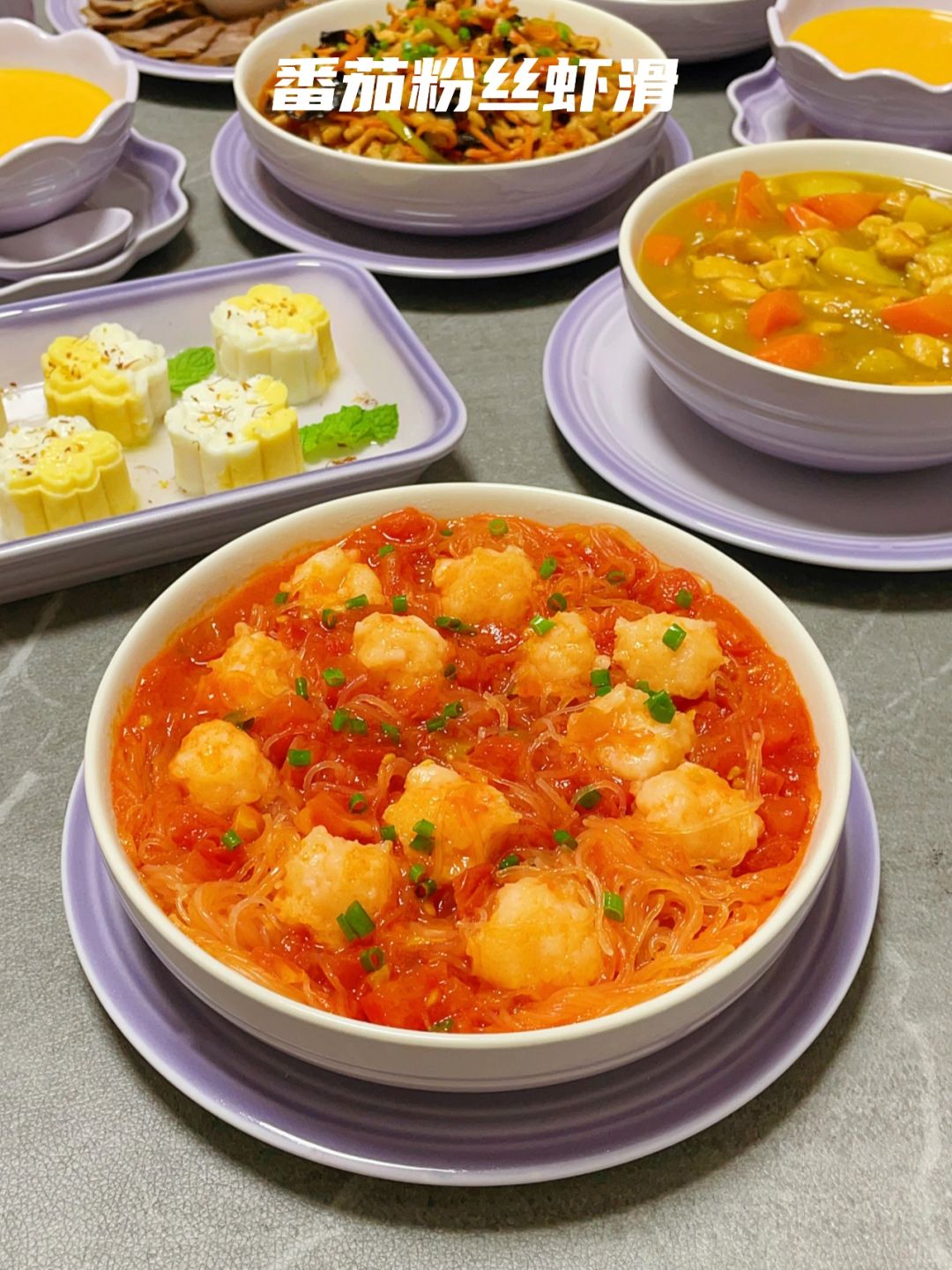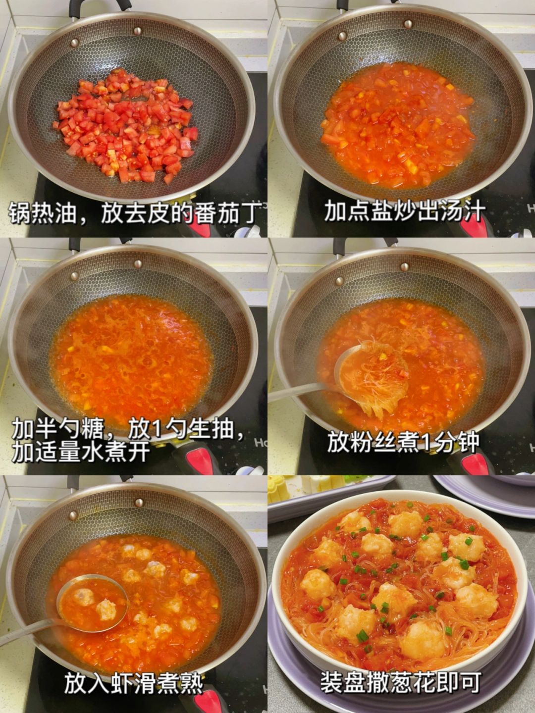 ✅番茄粉丝虾滑用熟一点的番茄更好,完全炒出茄汁,喜欢汤多一点就多加水,好吃到连汤也能喝光