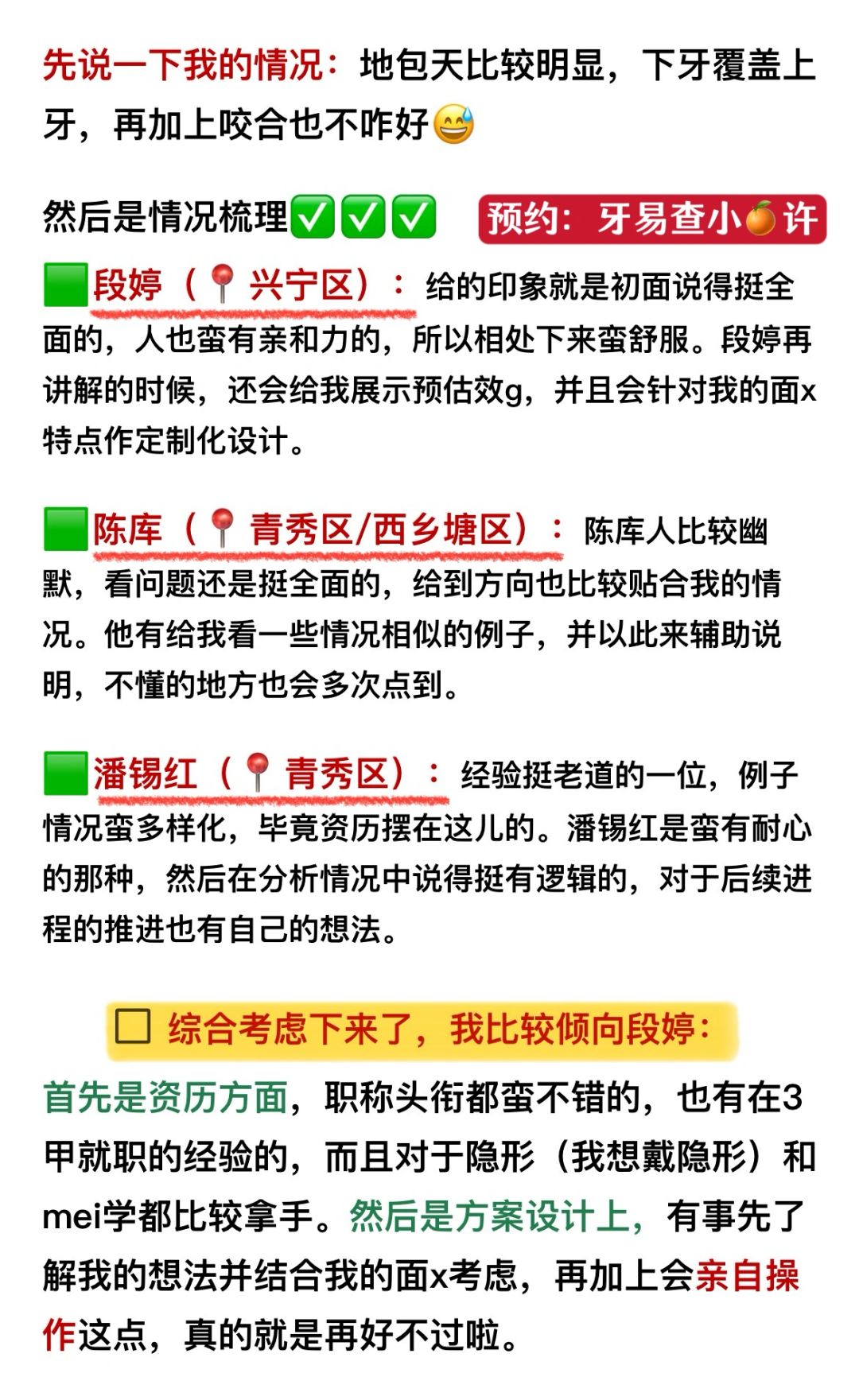 ✅2024的新计划,就是把我这口牙给弄了,新手小白做好准备工作后,选了3位伊森面谈‼️ . 我选到的是✔️段婷主任,除了资历好以及价+比合我意之外,她的案例效g非常吸引我,面谈相处下来也挺舒服的,能很快理解我想改善的点和度,然后用数据来分析可行性,而且会亲自上手,安全感拉满啦嘻嘻🥰 .