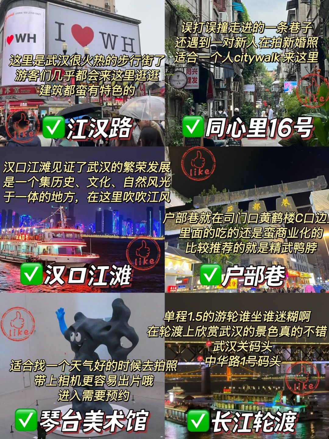 古德寺、琴台美术馆、湖北省美术馆、长江大桥、东湖景区、黎黄坡路、江汉关博物馆、昙华林、黄鹤楼、江汉路步行街、汉口江滩、湖北省博物馆、粮道街、同心里16号