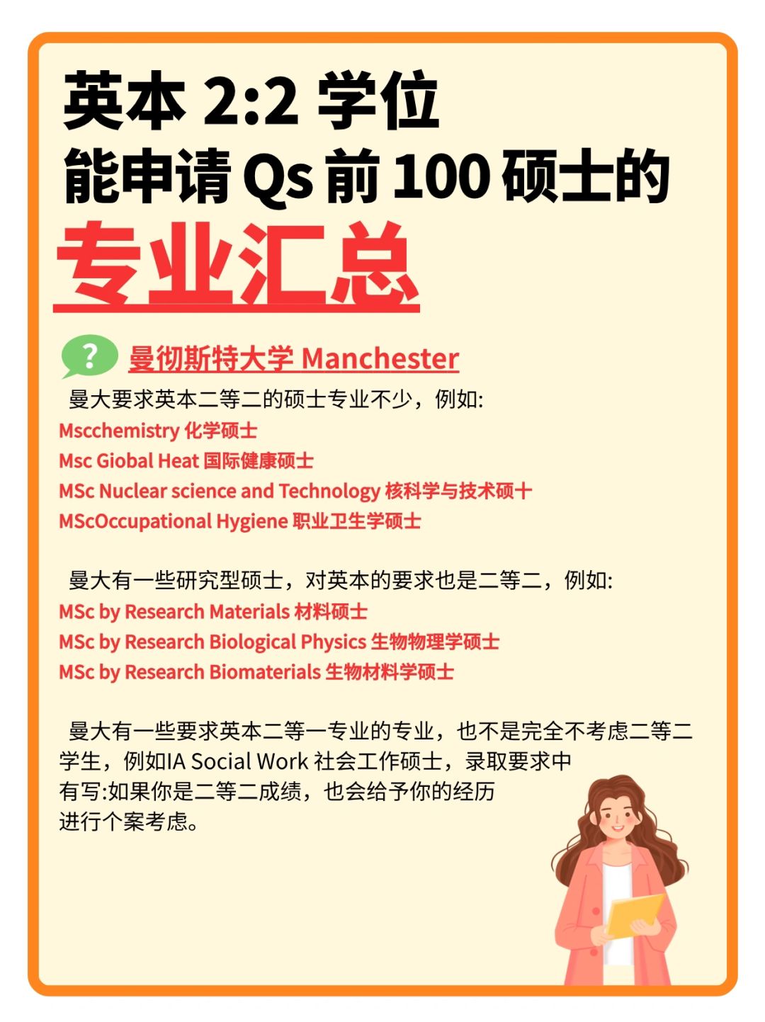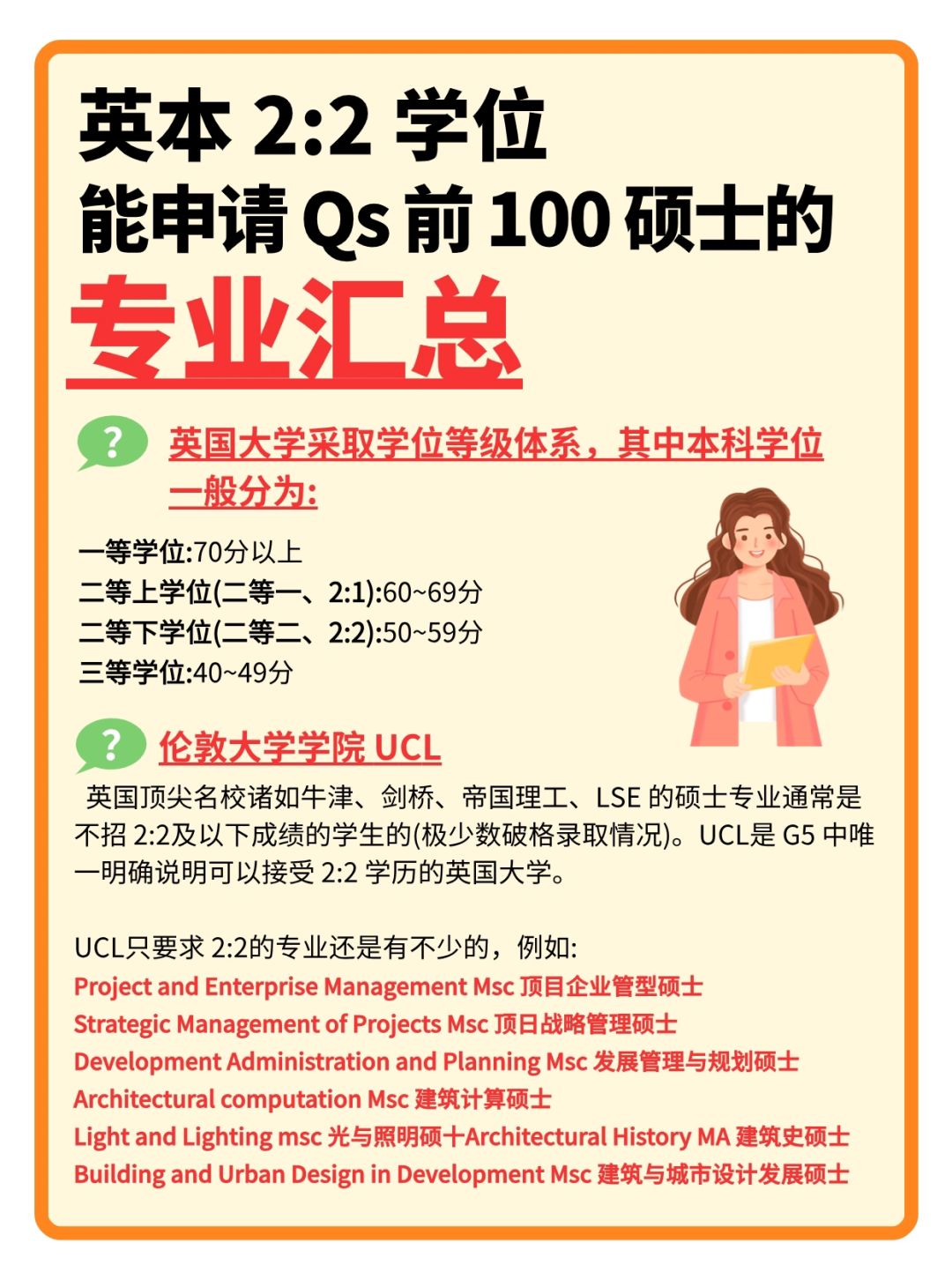 英国G5名校中如牛津、剑桥、帝国理工、LSE的硕士专业通常是不招2:2及以下成绩的学生的(极少数破格录取情况,一般也是新开设的专业才会接受2:2),UCL是G5大学中唯一官宣可以接受2:2学历的英国大学。