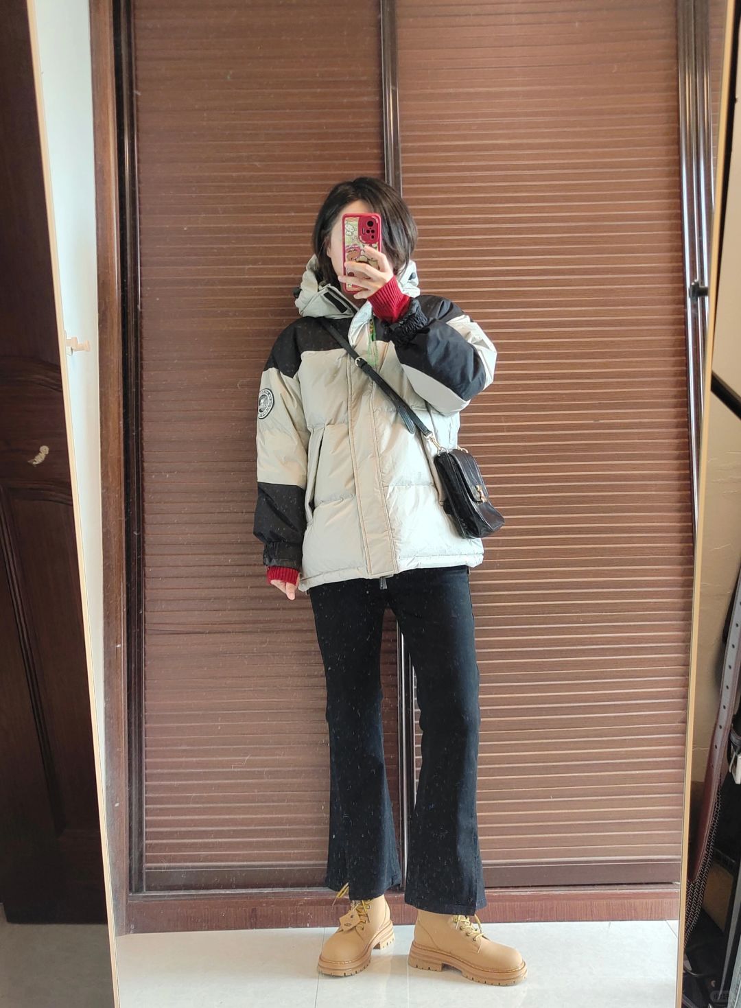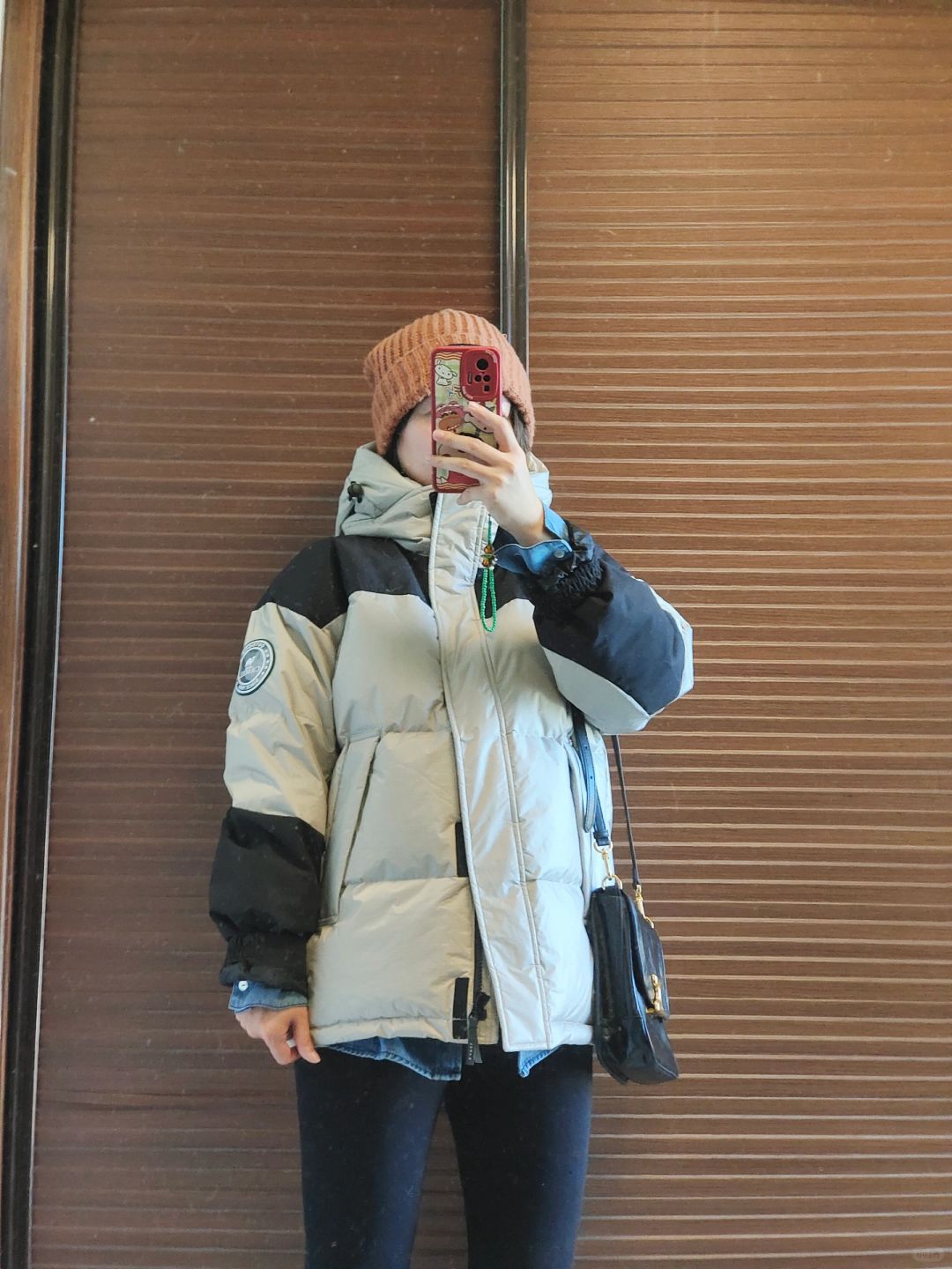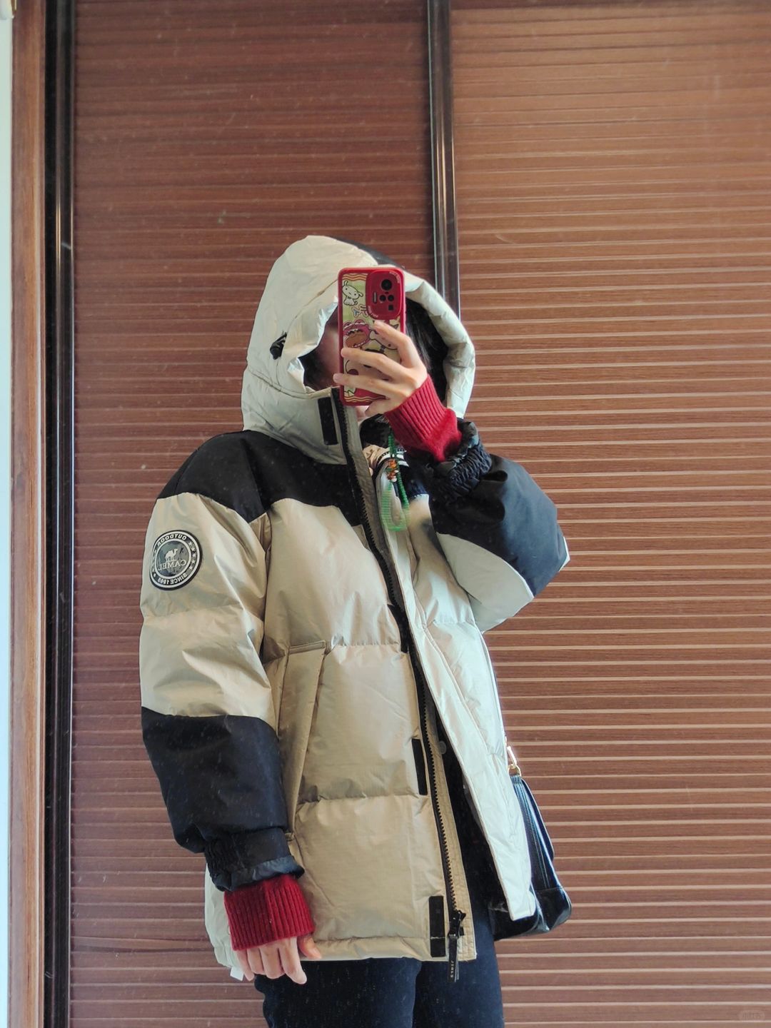 黑色羽绒服穿腻了 入了一件拼色款 清清爽爽 不用费力搭配 就足够特别🥰