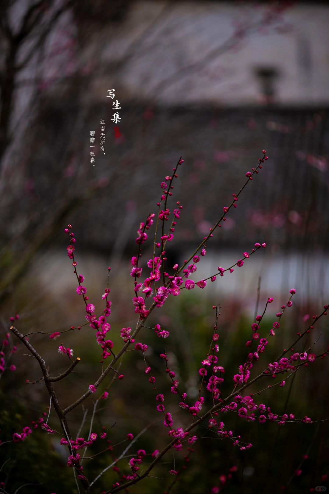 江南无所有, 聊赠一枝春。 ———— 江南的梅花有三处,而皖南的梅花只有一处——歙县的卖花渔村。 季节赶的正好,村里到处都是梅花,其中出彩的就是徽州骨红梅花。 ———— 徽州骨红,是梅花中的优良品种,花蕾倒卵形,紫红色;花态碟型,瓣疏叠,内常有碎瓣飞舞;花浓紫色;花丝水红色。