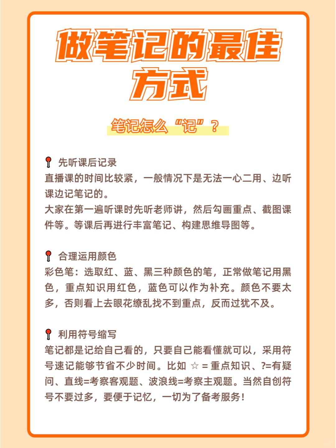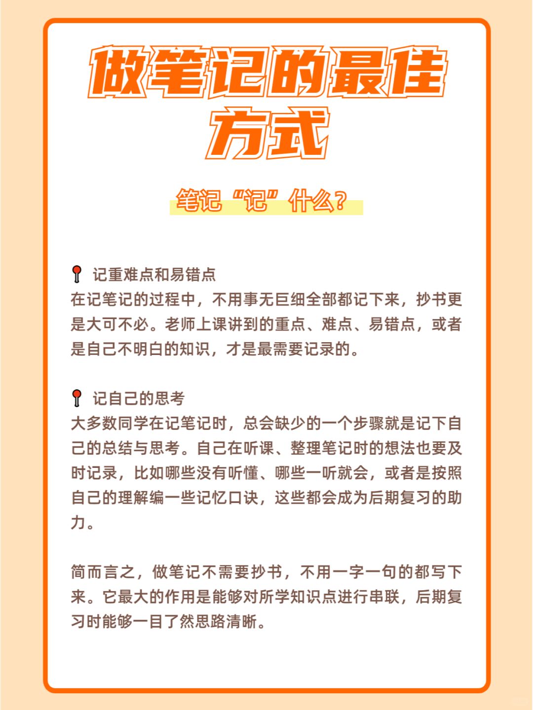 ① 做笔记并不是照搬老师讲的全部内容,而是提纲挈领的进行知识点串联,形成思维导图,一回顾立马能够思路清晰,要点齐全,便于重点记忆。