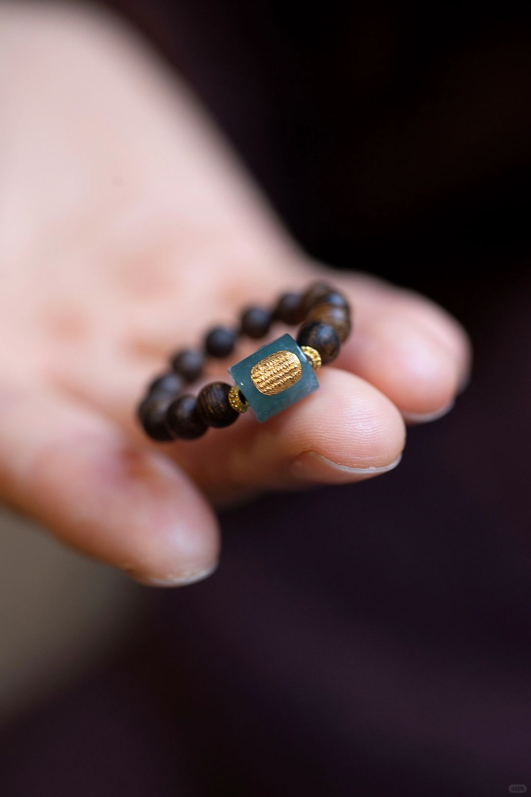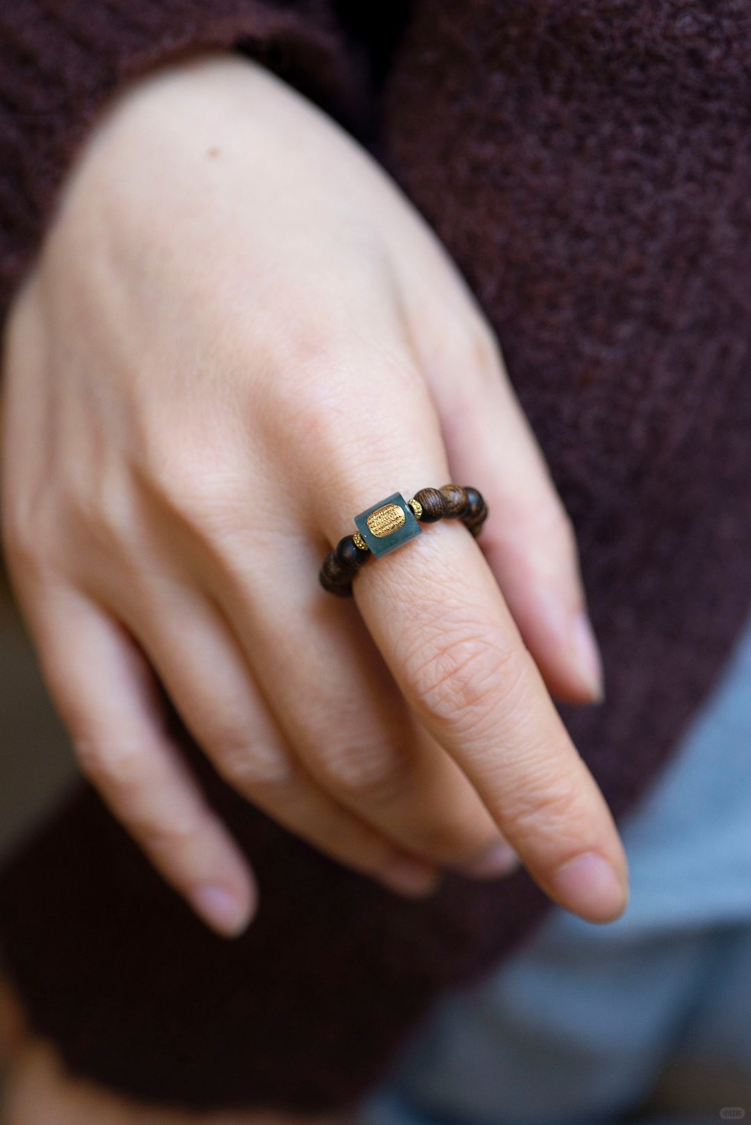 沉香【五条经文】翡翠戒指+18 K金配饰 每条经文分别代表着守护你的 平安、顺利、人缘、财运、健康