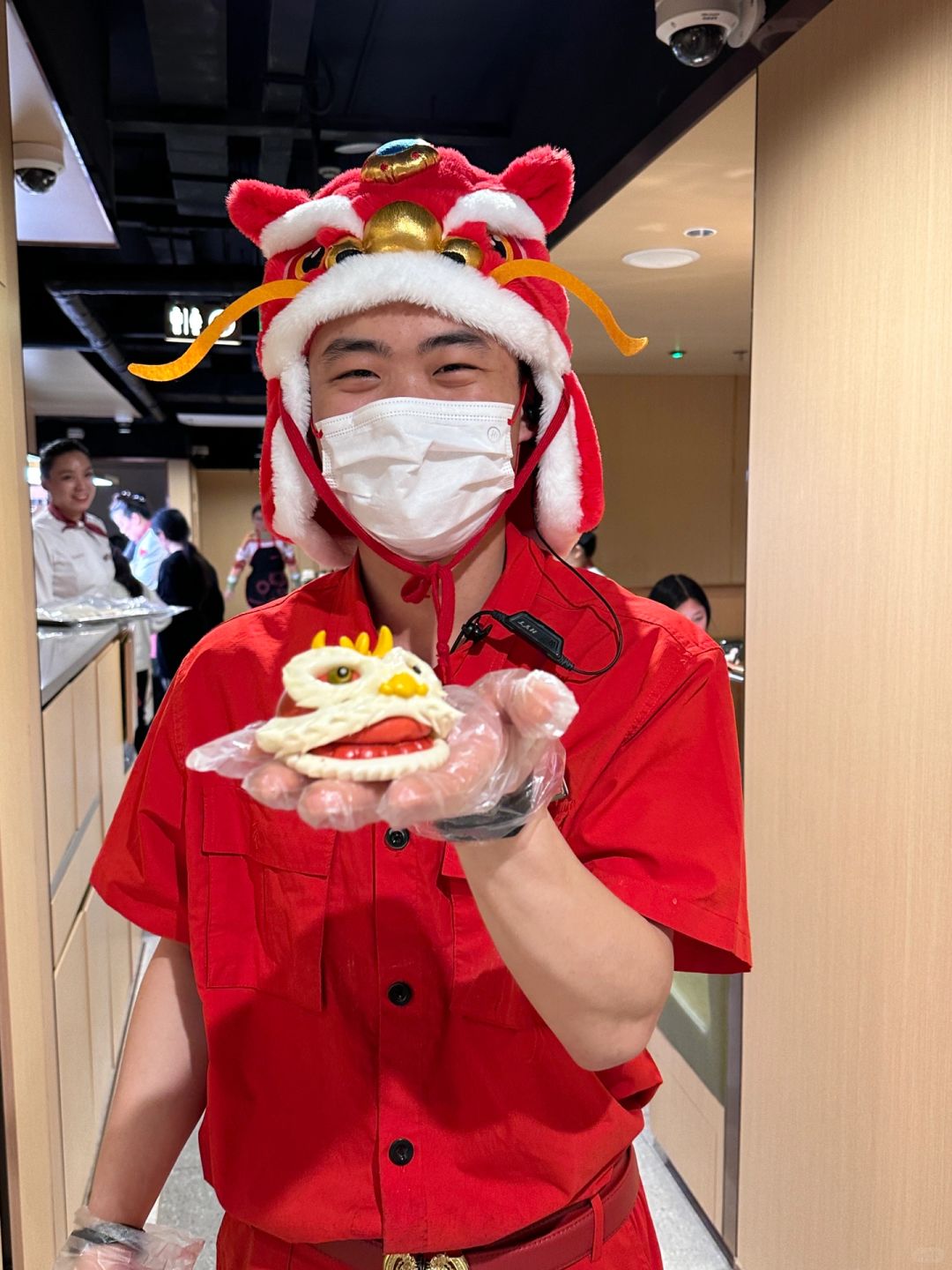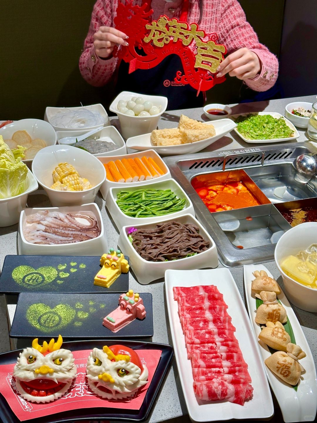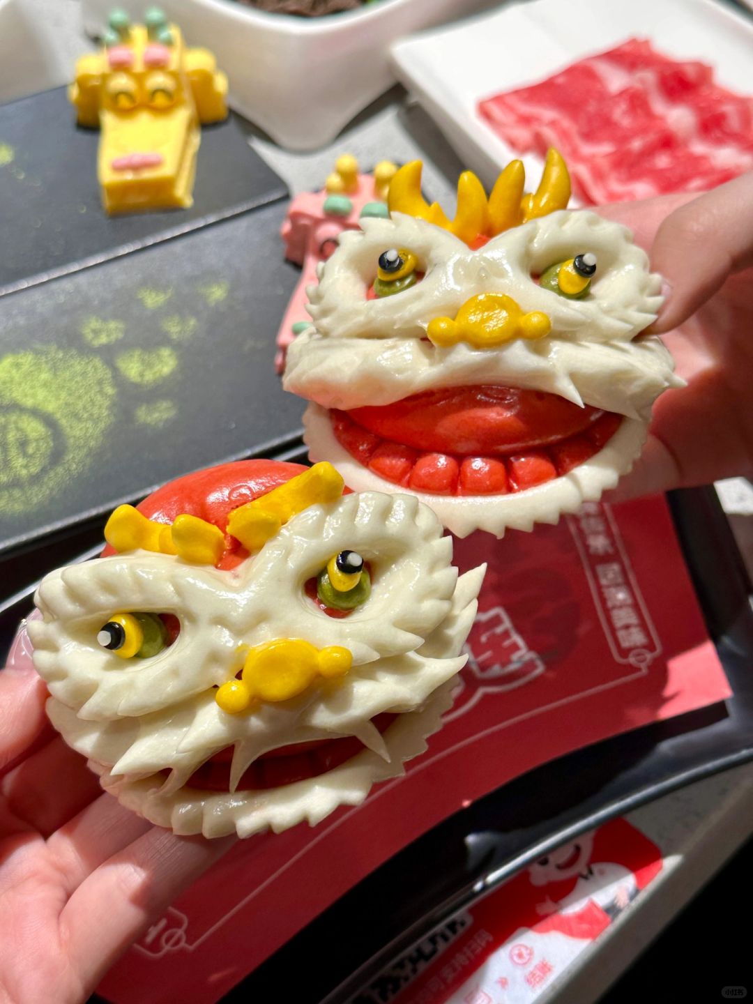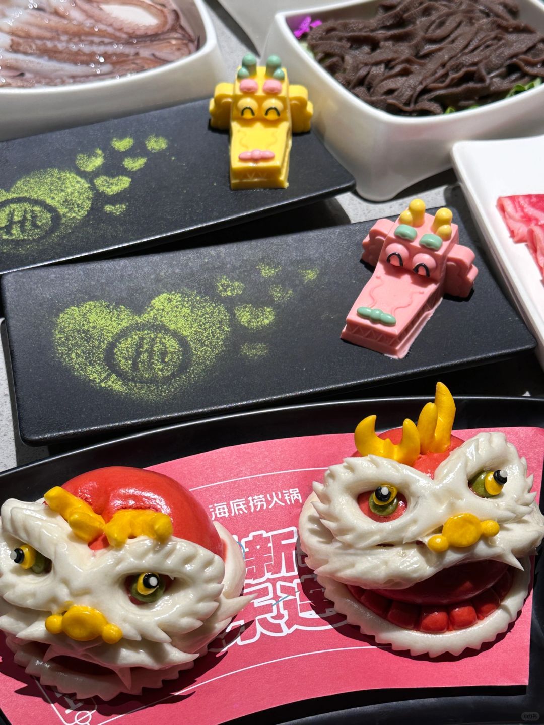 又又又来海底捞做饭了!!! 海底捞最近的新年氛围真的好浓! 蒸奇斗艳花馍还有人没点的嘛! 龙头造型的花馍,内馅儿是糯叽叽的紫薯泥!你龙我龙慕斯,粉色黄色分别是白桃和橙子味的!! 入口即化!口感清甜!戴着龙头帽的小哥给我送上了大🐲龍馍馍太可爱噜~