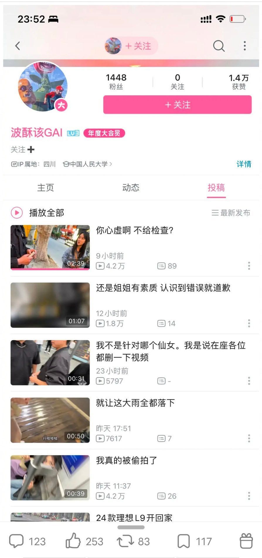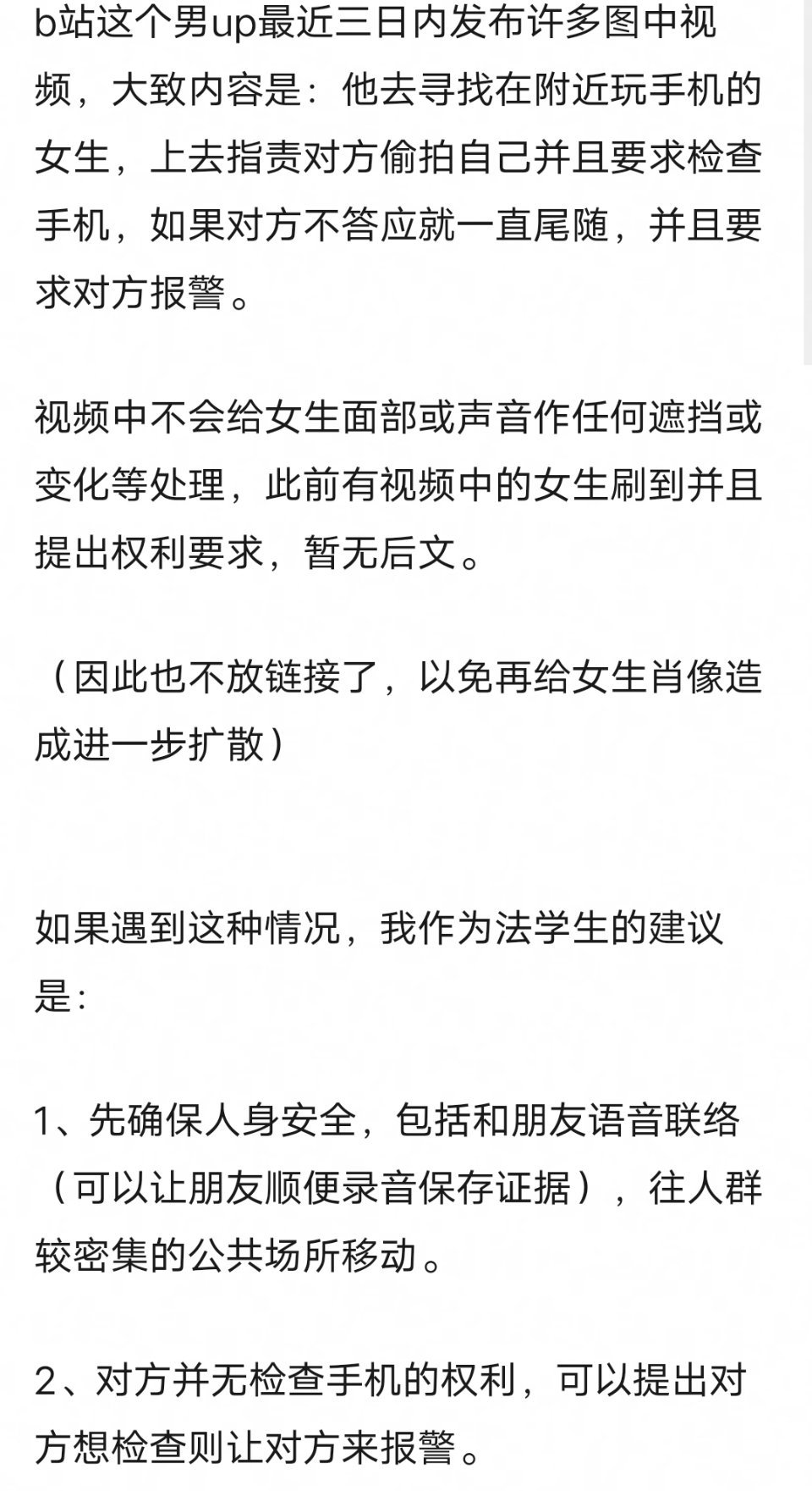 今天好几个姐妹投了同样的稿,内容大致是B站一位男UP主拍了一个系列的视频,视频的内容都是找周围玩手机的女生(目标),诬陷她们正在偷拍自己,并要求检查她们的相册和最近删除。在视频中,他大喊:我们男的被偷拍的还少吗。