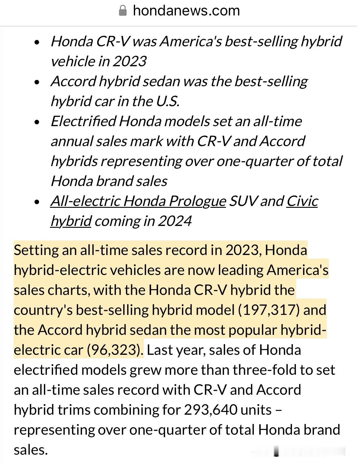 日系车真是干什么都慢。去年本田才开始在美国大规模布局混动。CRV去年全美销量36万多台,其中19.7万台是混动版,占比过半;雅阁销量19.8万台,其中混动版9.6万台,同样占了近半壁江山,但是插混PHEV在美国目前一款都没有。中美国情的差异对市场的影响也确实太明显了:像美国这样油不贵、电不便宜、PHEV不免销售税、动力电池死贵的大环境,PHEV综合性价比甚至不一定比得过纯电,倒是HEV仗着省油、小电池成本低,反倒是全天候综合成本最低的电动化车型。像我的雅阁混动,油价80美分/升,平均车速50-60km/h,油耗百公里5升,百公里油费4美元。而本地电价25美分/度,同样均速最省也得百公里15度电以上,百公里电费也将近4美元,冬天还得上浮至少20%。所以纯电在美国对我个人没有任何吸引力,省不了钱,还得忍受补能慢、续航短的弊端。