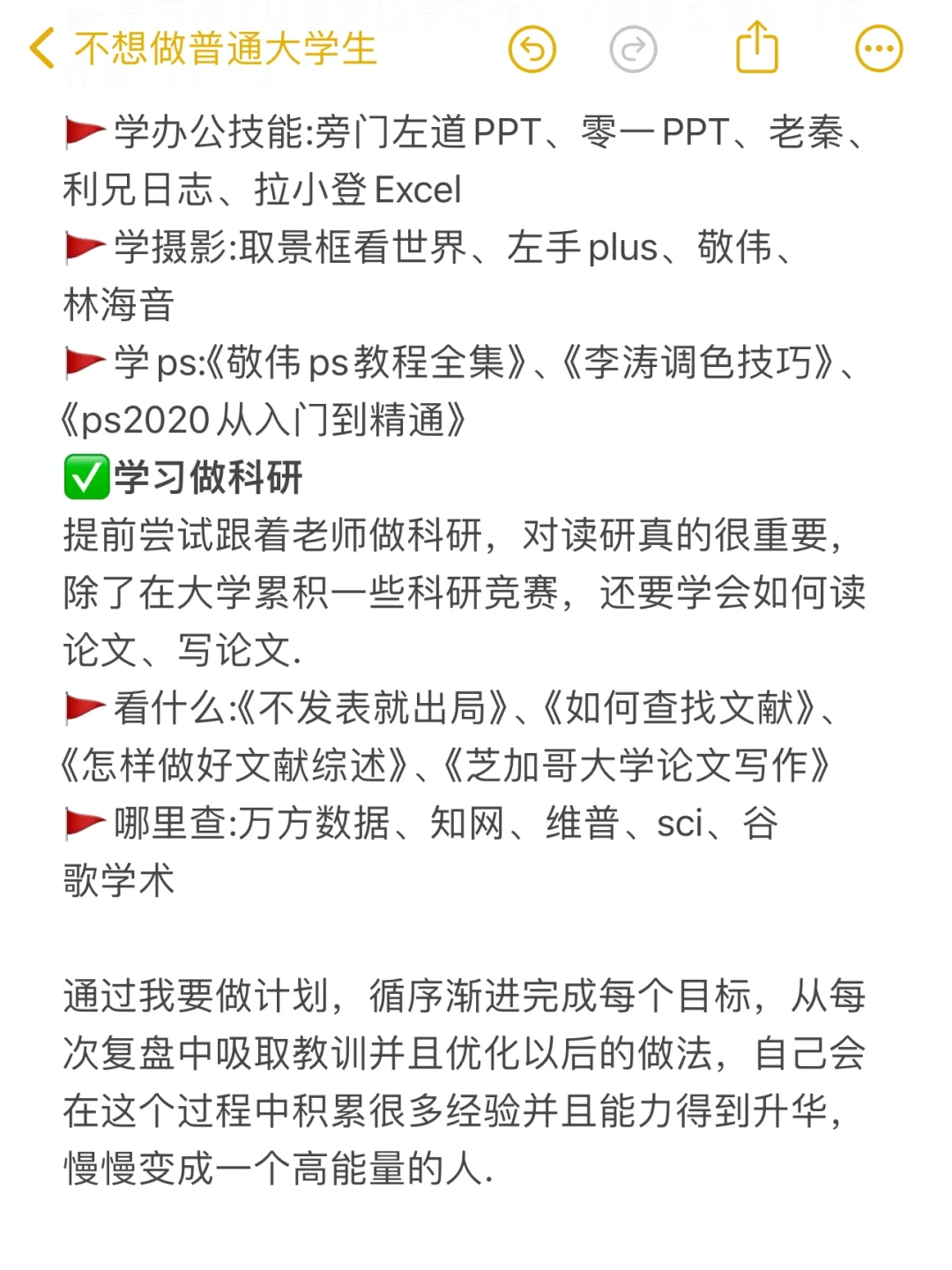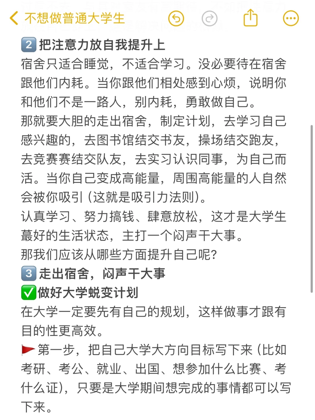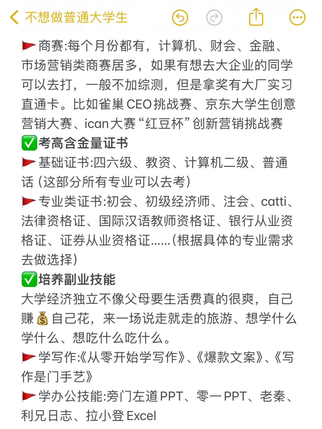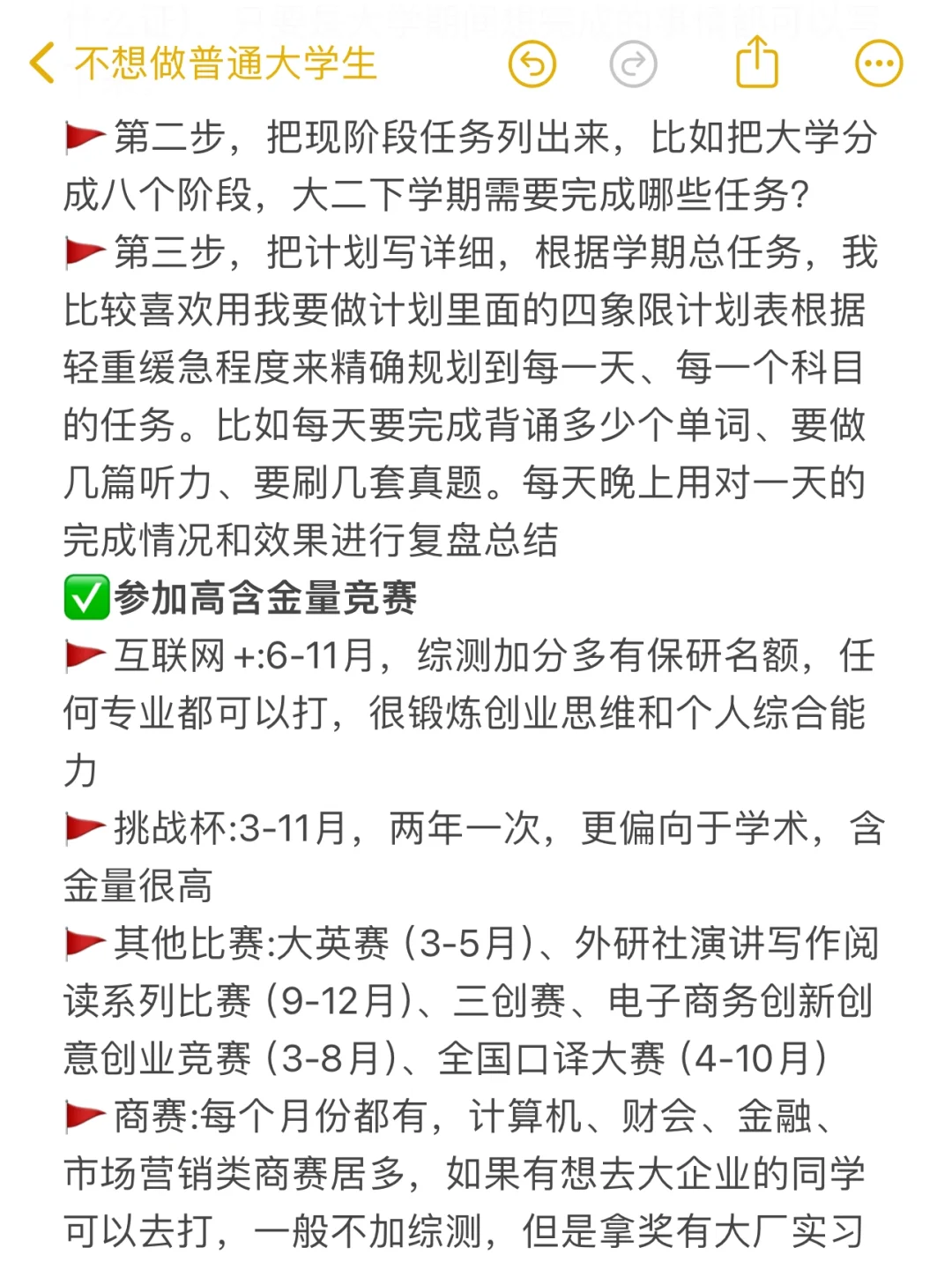 🚩第一步,把自己大学大方向目标写下来(比如考研、考公、就业、出国、想参加什么比赛、考什么证),只要是大学期间想完成的事情都可以写下来。