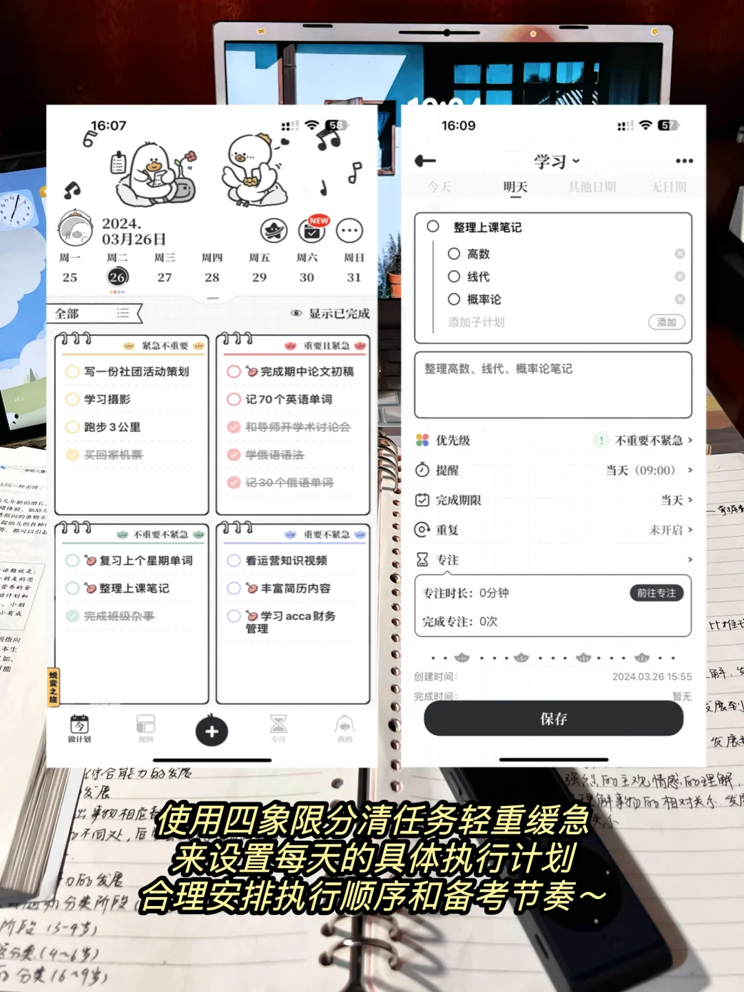 🚩第三步,把计划写详细,根据学期总任务,我比较喜欢用我要做计划里面的四象限计划表根据轻重缓急程度来精确规划到每一天、每一个科目的任务。比如每天要完成背诵多少个单词、要做几篇听力、要刷几套真题。每天晚上用对一天的完成情况和效果进行复盘总结