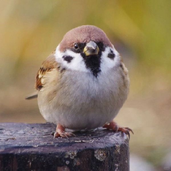 🍀形态特征:树麻雀体长13-15厘米,虹膜暗红褐色,嘴一般为黑色,但冬季有的呈角褐,下嘴呈黄色;额、头顶至后颈栗褐色,头侧白色,耳部有一黑斑,在白色的头侧极为醒目;背沙褐或棕褐色具黑色纵纹,颏、喉黑色,其余下体污灰白色微沾褐色;脚和趾等均污黄褐色。