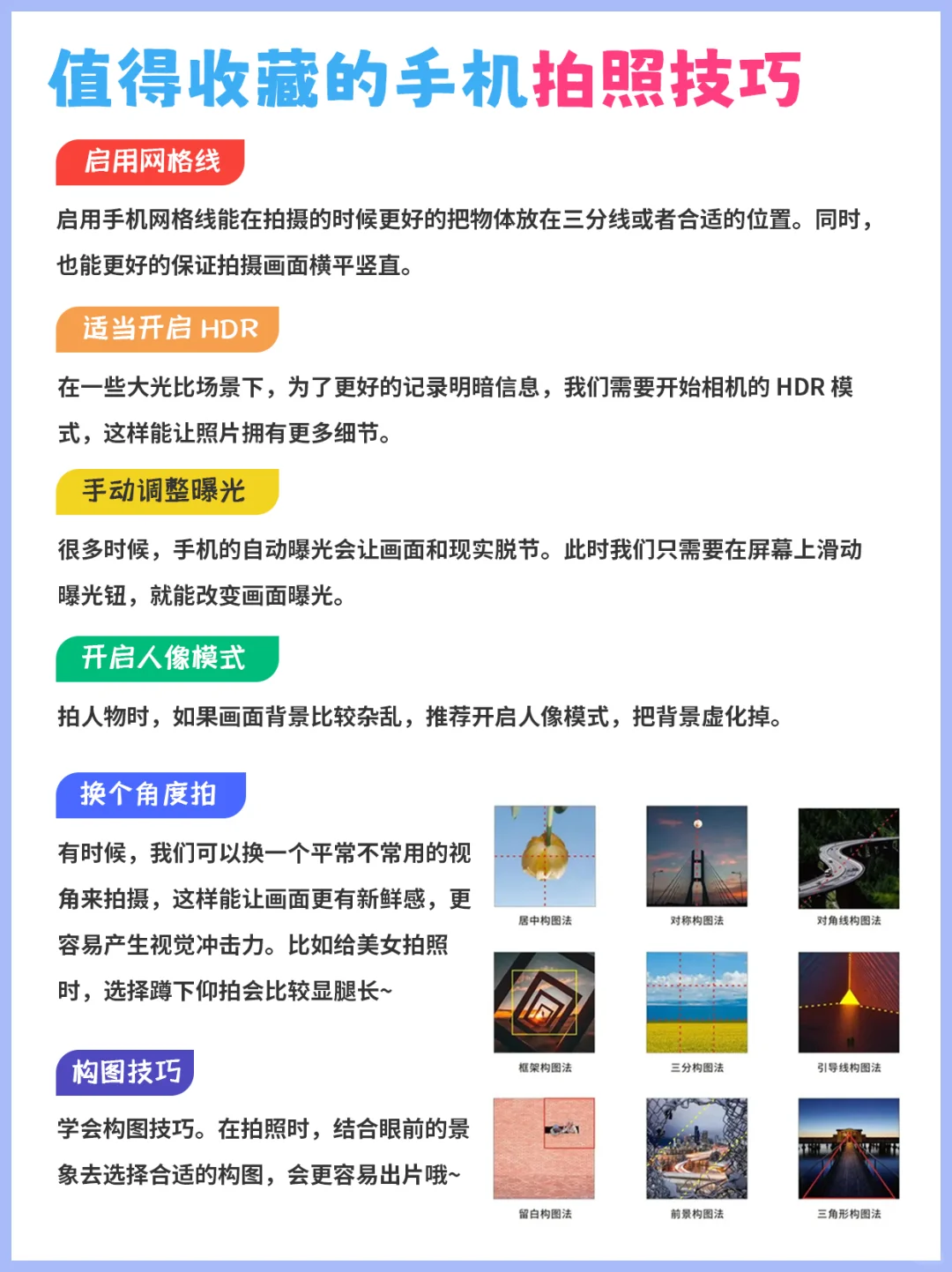 学会构图技巧。在拍照时,结合眼前的景象去选择合适的构图,会更容易出片哦~