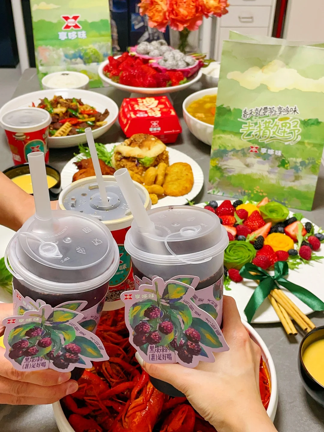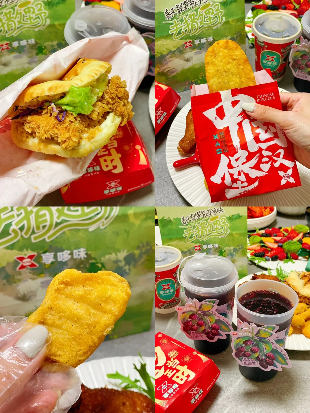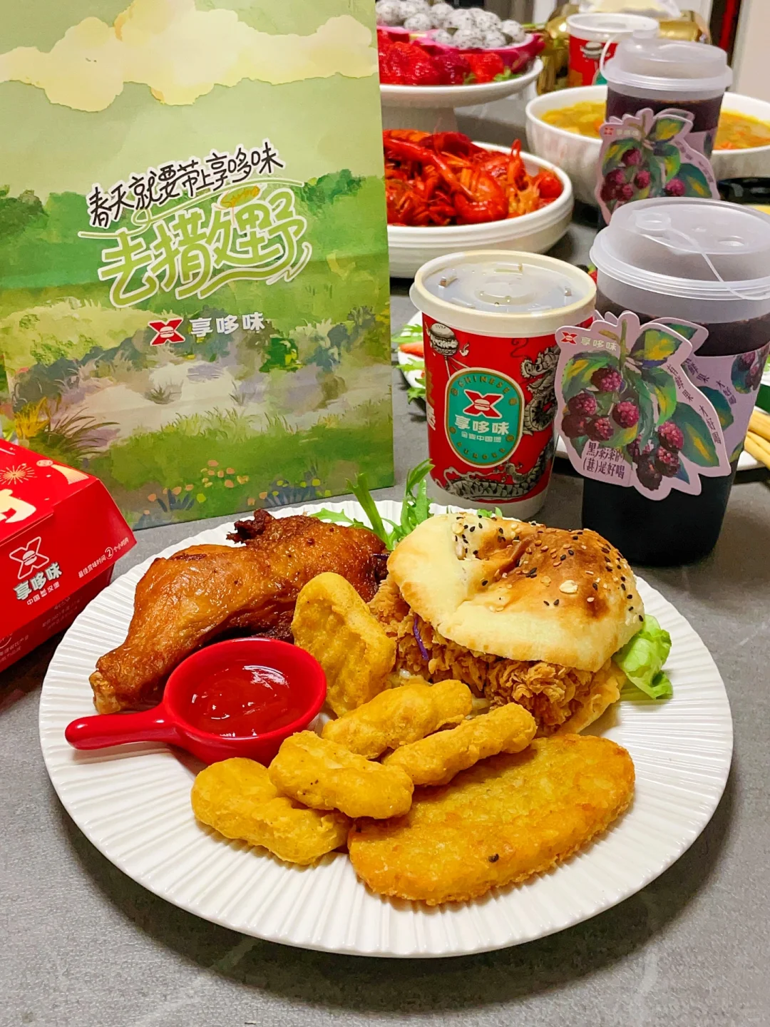 除了一些应季蔬菜,我还点了享哆味去撒野春日六件套,连包装都是满满的春天气息。套餐内容很丰富:香辣鸡腿堡+爆汁嫩嫩大腿排+薯饼+鸡块+可乐+多汁多肉黑桑葚,都是我喜欢吃的。