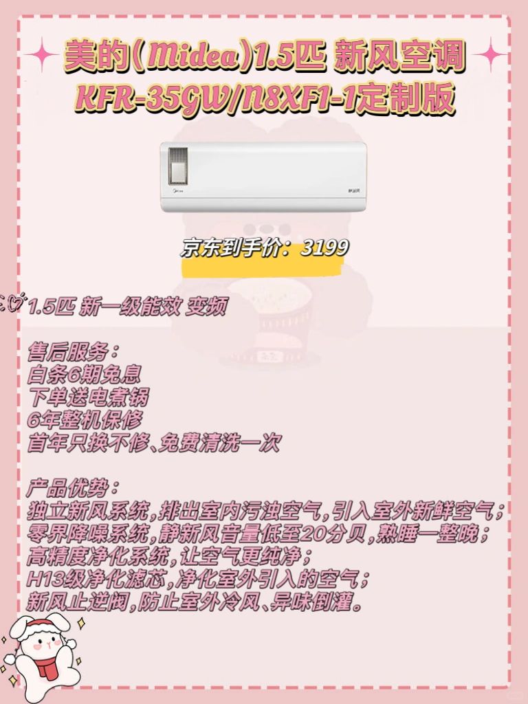 🌟🌟在经过仔细的对比之后,我也整理出三款整体性价比高的空调推荐给大家,分别是美的1.5匹新风空调、格力1.5匹云佳挂机和小米1.5匹一级变频空调。🤗