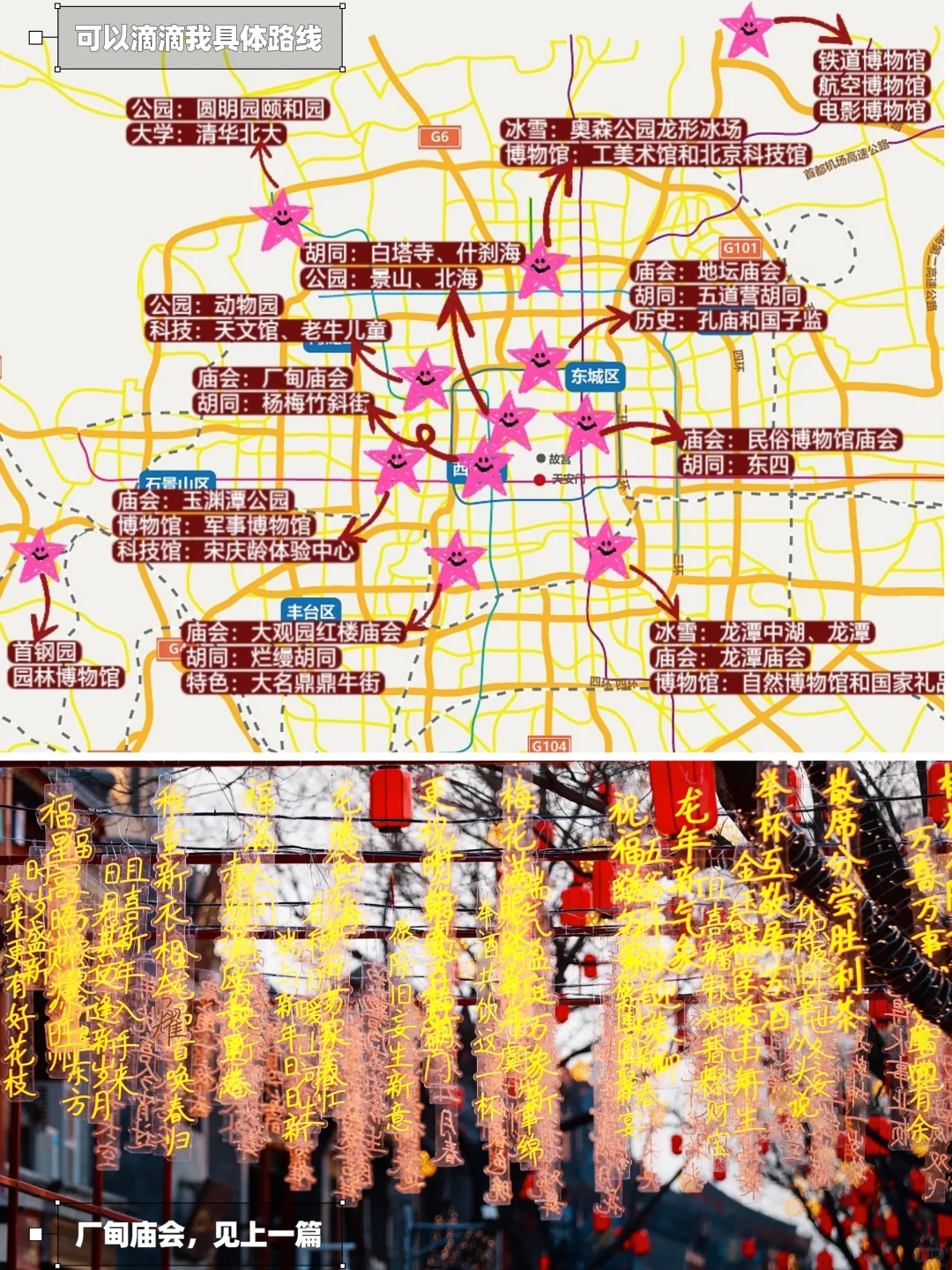 4⃣公园庙会:地坛、龙潭、厂甸是老牌的,大观园红楼和东岳庙很期待,具体可以看最后一张地图,庙会和周边一起逛。