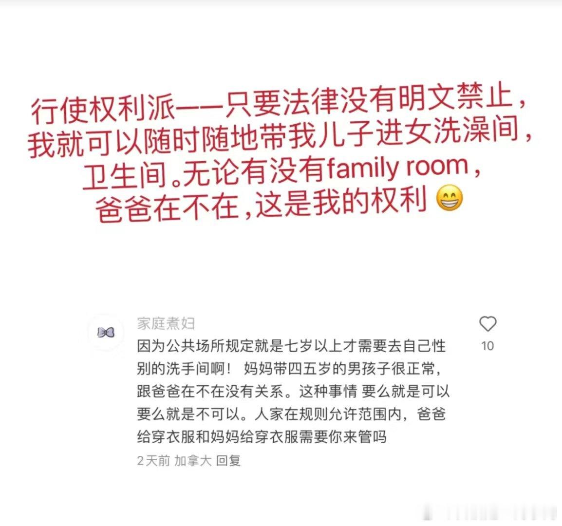 “即使我儿子已经四岁半了,即使我老公在,我也要带儿子去女厕所,我要以老公为主~”