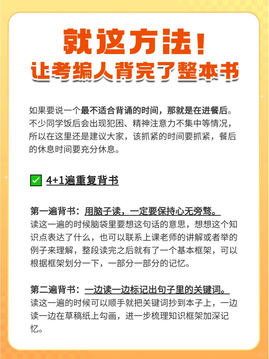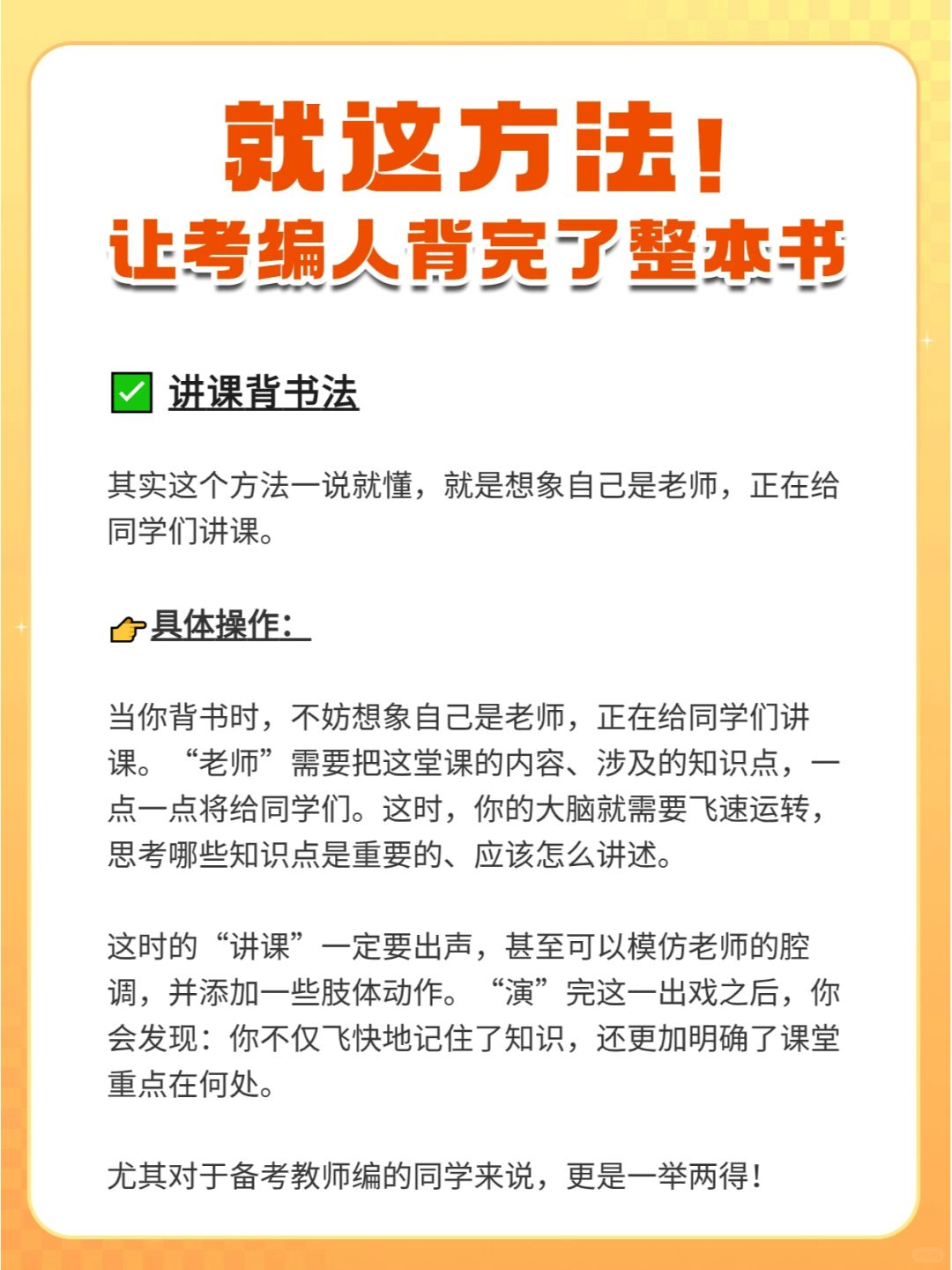 同学们可以与自己的学习习惯相结合,摸索出最适合自己的背书时间;再采用最适合自己的背书方法,拿下教师招聘考试!