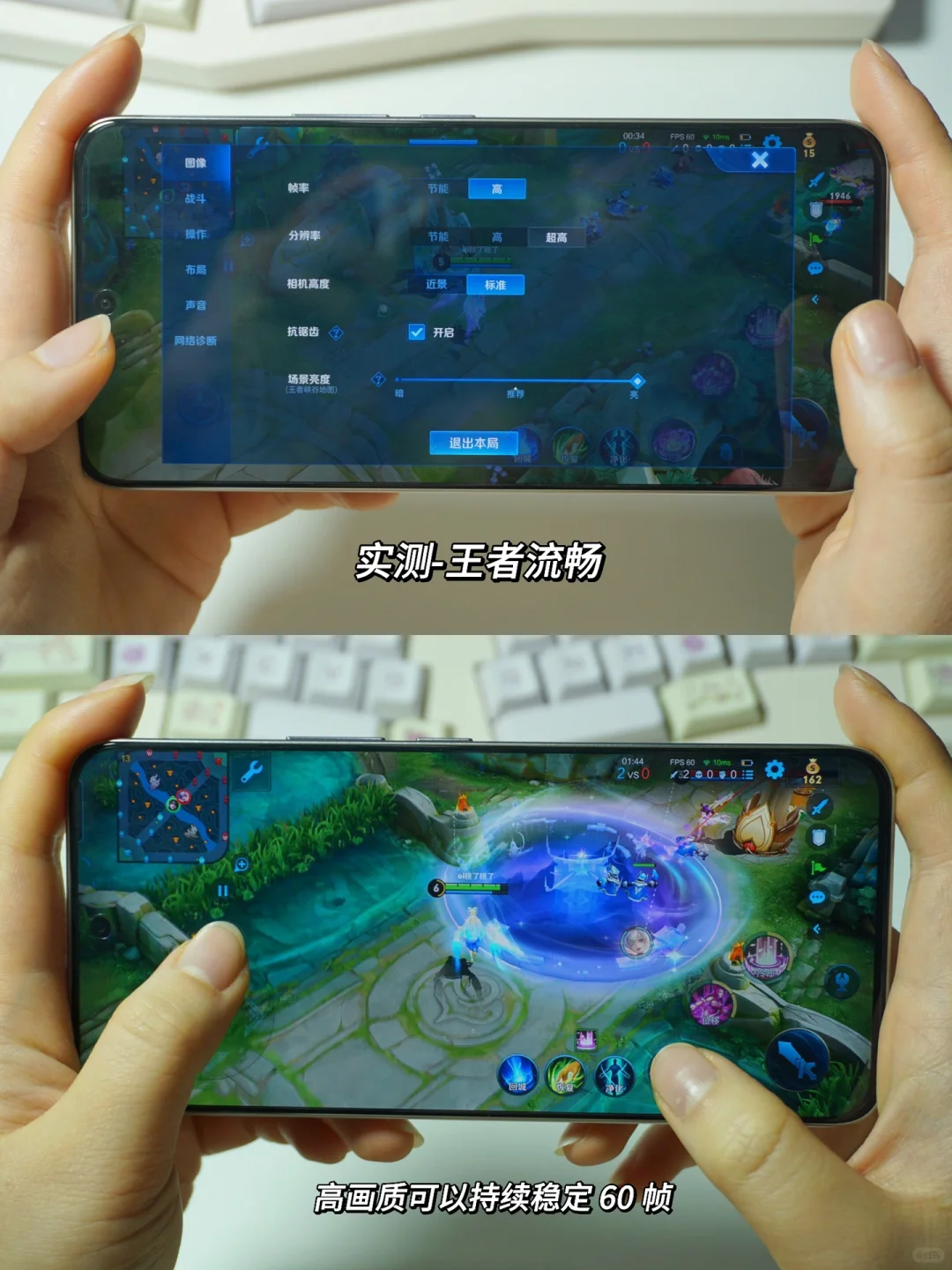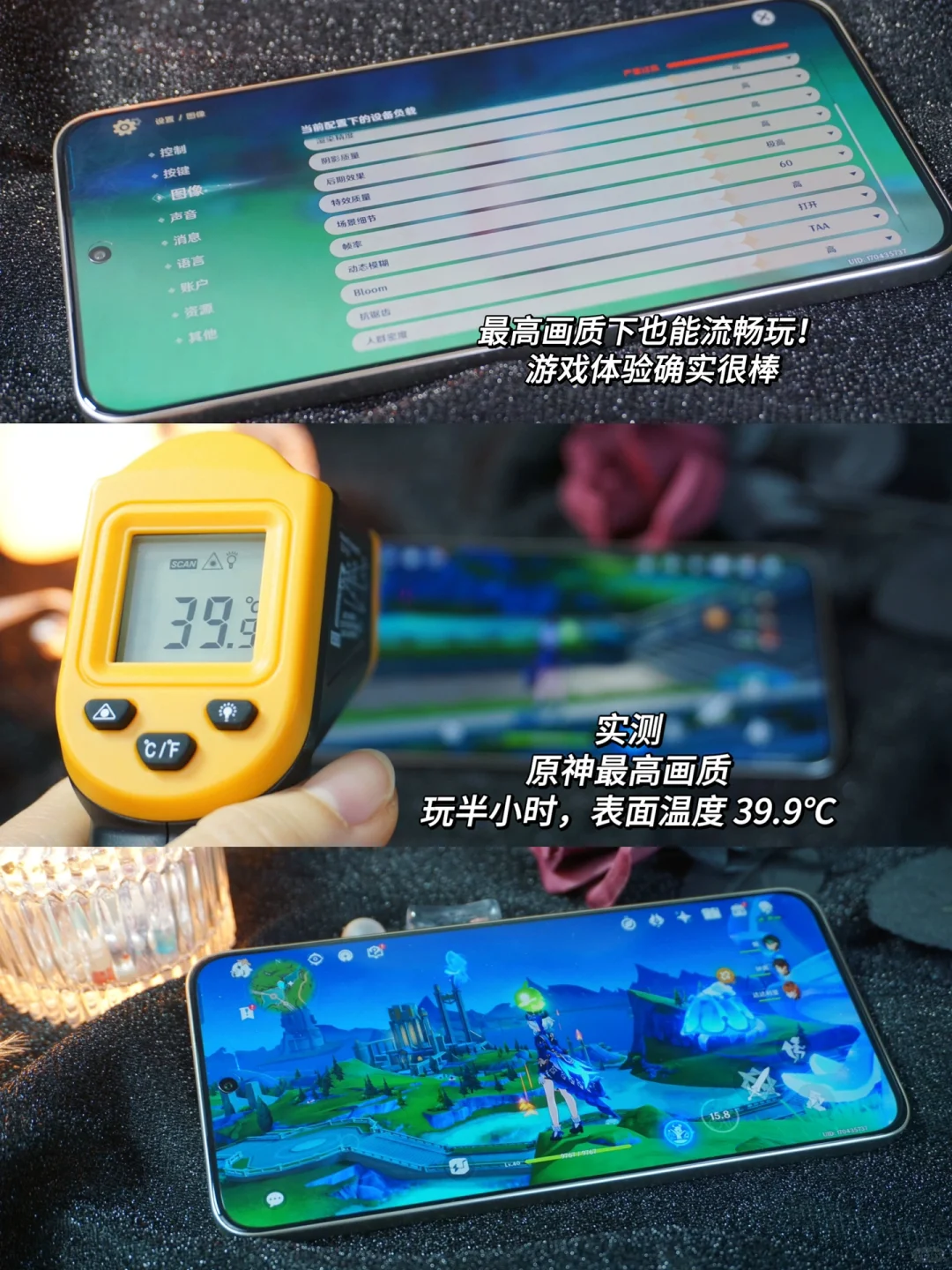 性能方面:性能方面我们实测,原神最高画质60帧设定,大部分场景都可以流畅玩游戏,吃鸡和王者的流畅度非常高,日常是可以满足游戏需求的,内存高达24G+1T的选配,大家在购买的时候,可以根据自己的需求购买,我们也对游戏后的表面温度进行了测试,根据我们实测,半小时高画质原神后,手机表面温度最高位40°C,可以说温控做的真的非常好🌟