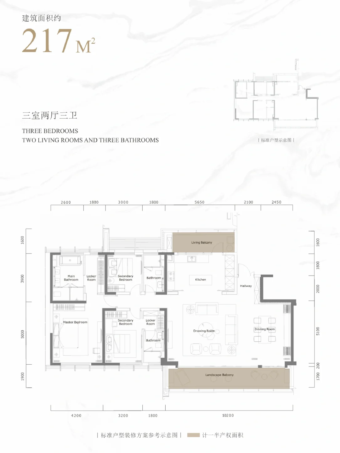 当然精装标准:全屋臻享超极「三大件」:大金中央空调、博世地暖系统、霍尼韦尔新风系统,全球高端的餐厨臻品:餐厨柜体、厨电设备臻选科勒、博世、高仪、罗格朗等名牌