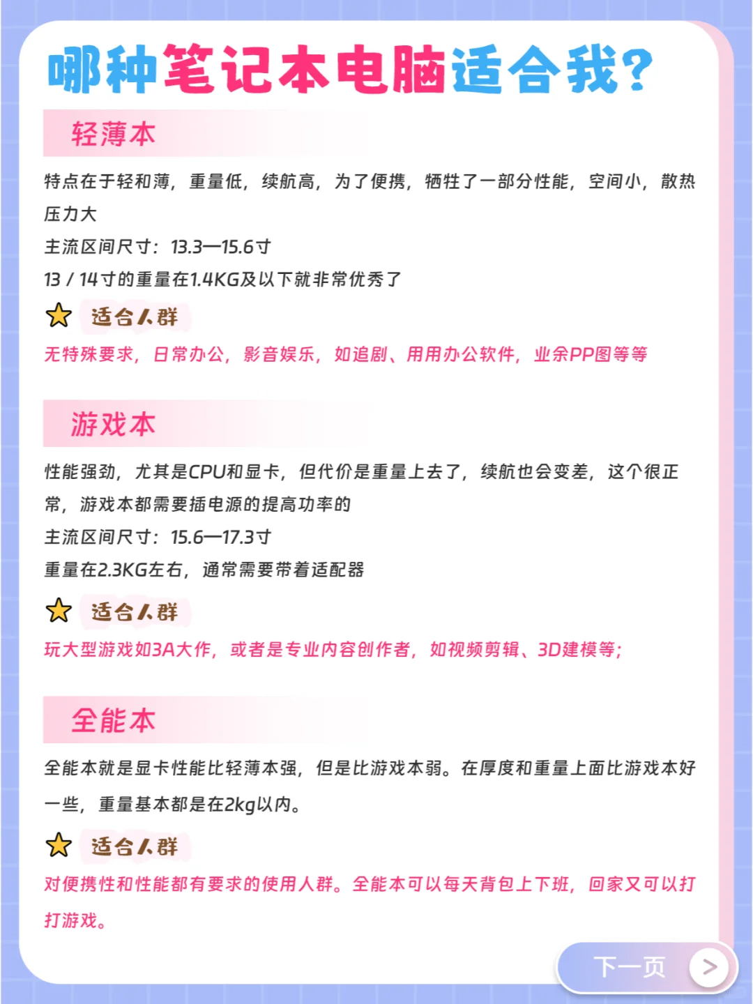 💻全能本:全能本就是显卡性能比轻薄本强,但是比游戏本弱。在厚度和重量上面比游戏本好一些,重量基本都是在2kg以内。