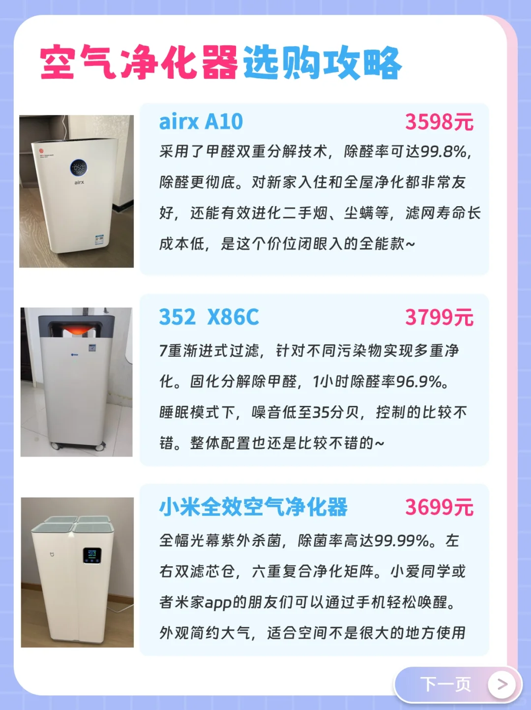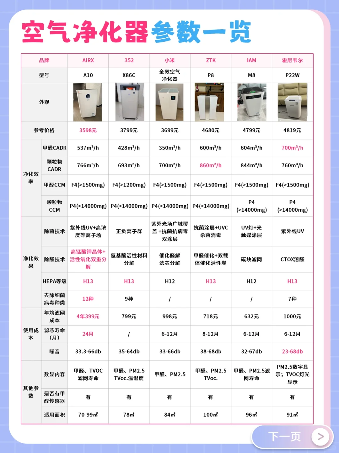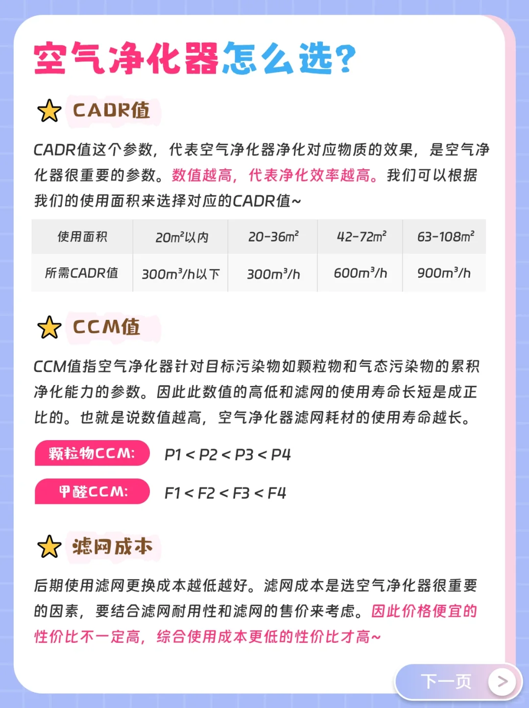 后期使用滤网更换成本越低越好。滤网成本是选空气净化器很重要的因素,要结合滤网耐用性和滤网的售价来考虑。因此价格便宜的性价比不一定高,综合使用成本更低的性价比才高~