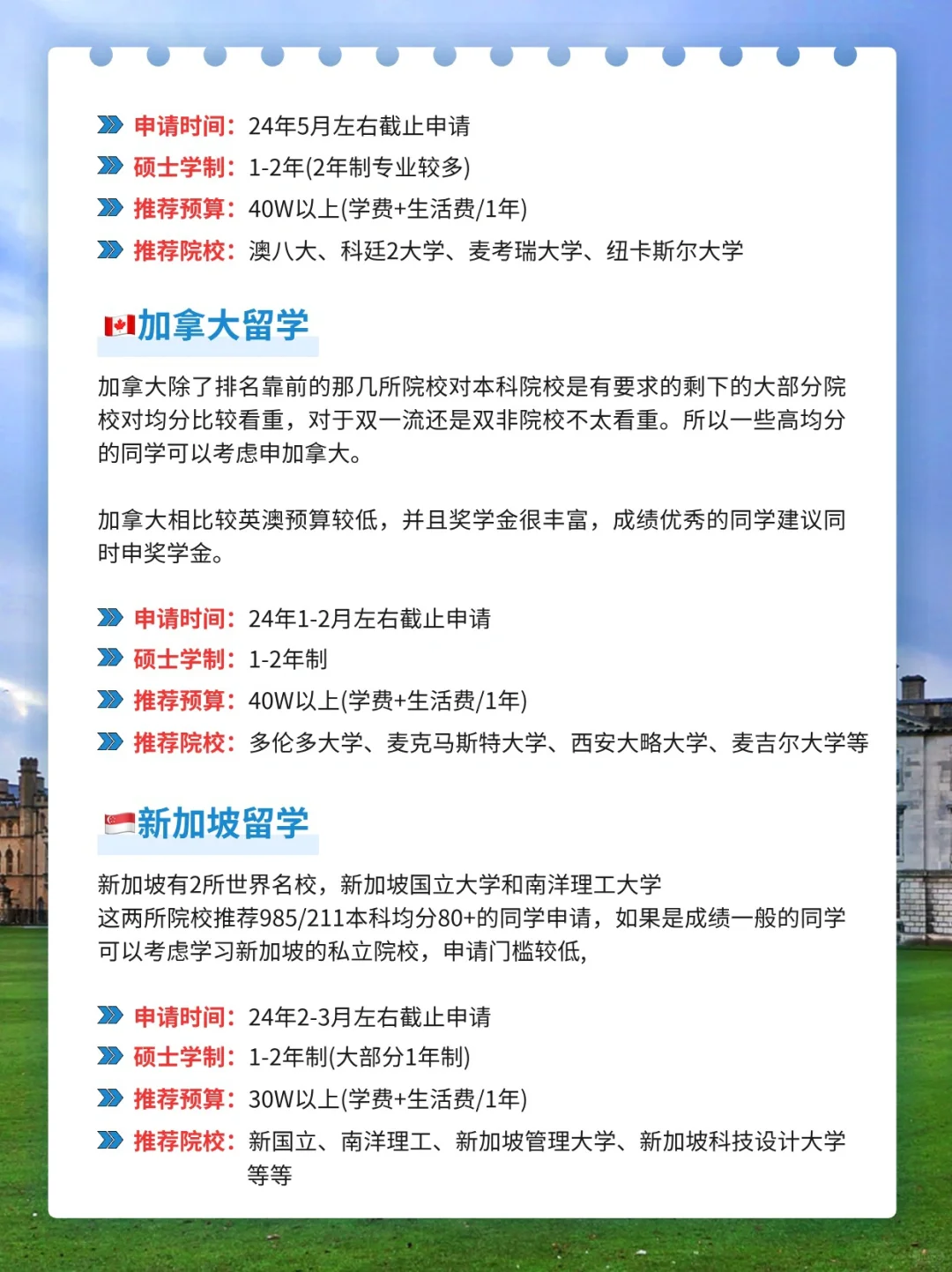 - 新加坡有两所世界知名高校——新加坡国立大学和南洋理工大学。这两所院校更倾向于招收 985/211 院校的学生,且均分需在 80 分以上。对于成绩一般的同学,可以考虑申请新加坡的私立院校,这些院校的申请门槛相对较低。