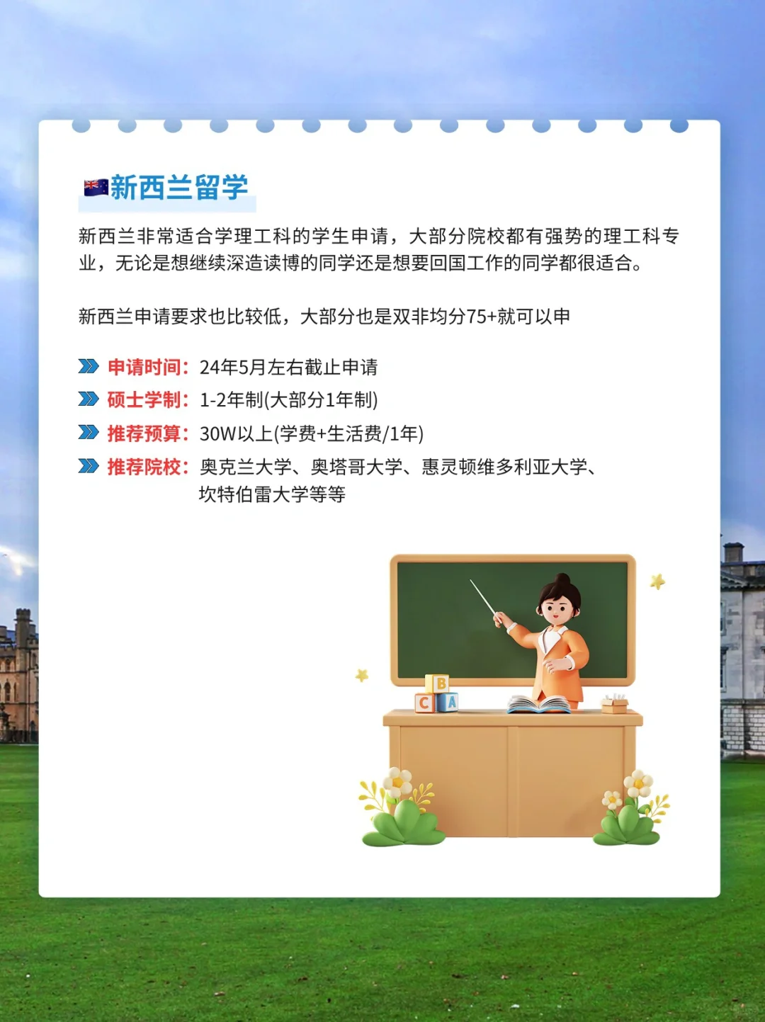 - 新西兰非常适合理工科学生申请,其大部分院校都有出色的理工科专业。无论是想继续深造还是回国就业,都是不错的选择。新西兰的申请要求相对较低,多数双非学生均分达到 75 分以上即可申请。