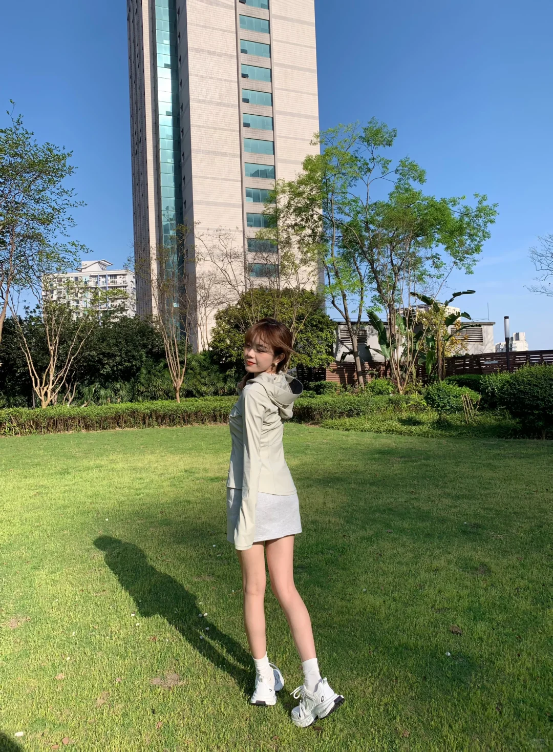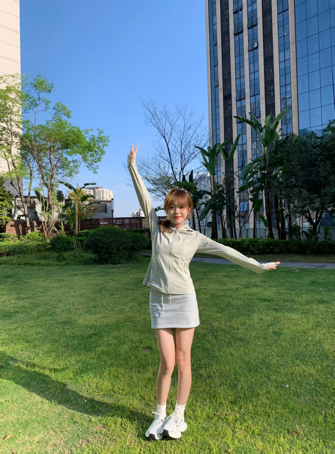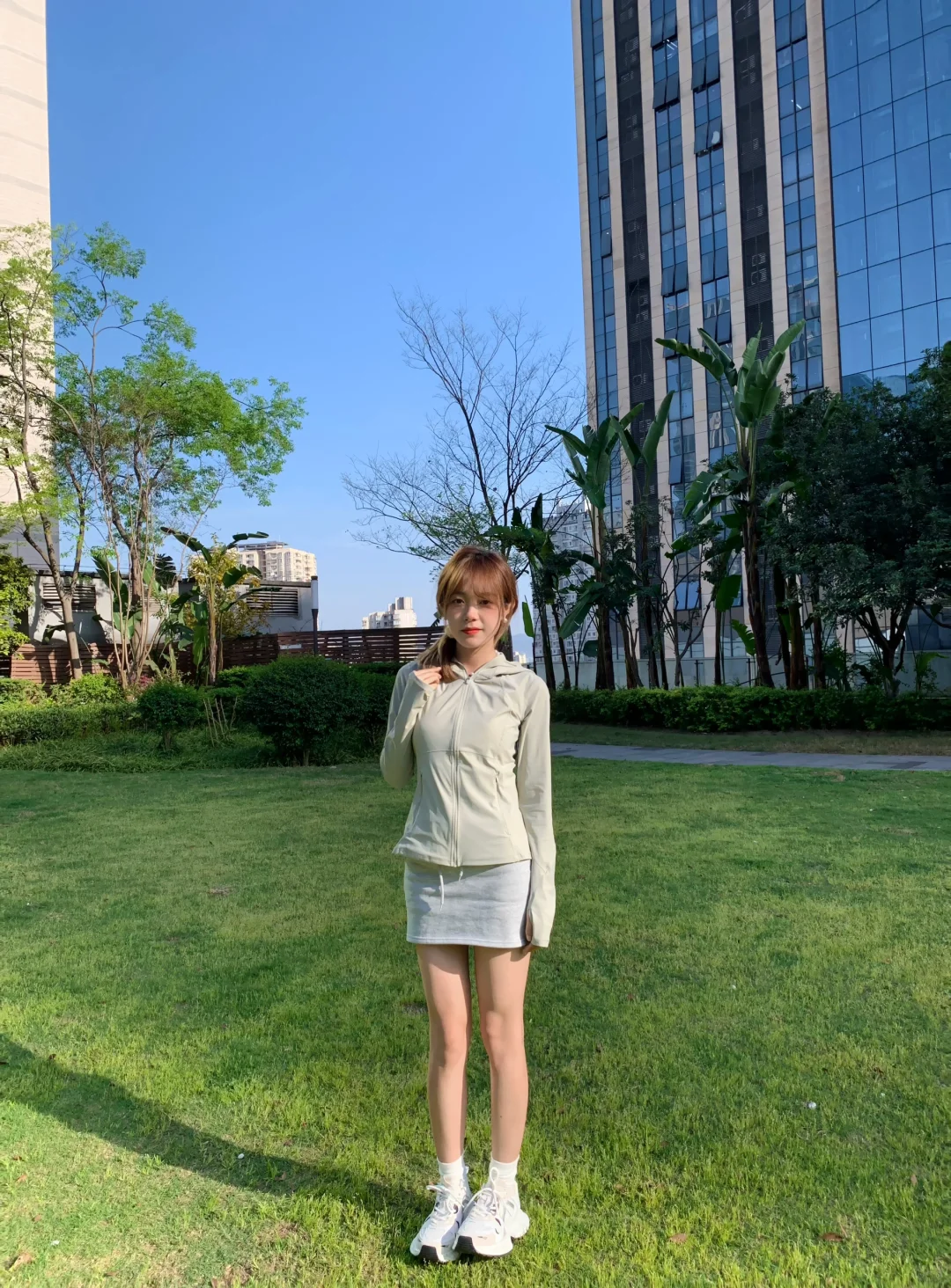 搭配灰色短裙和运动鞋