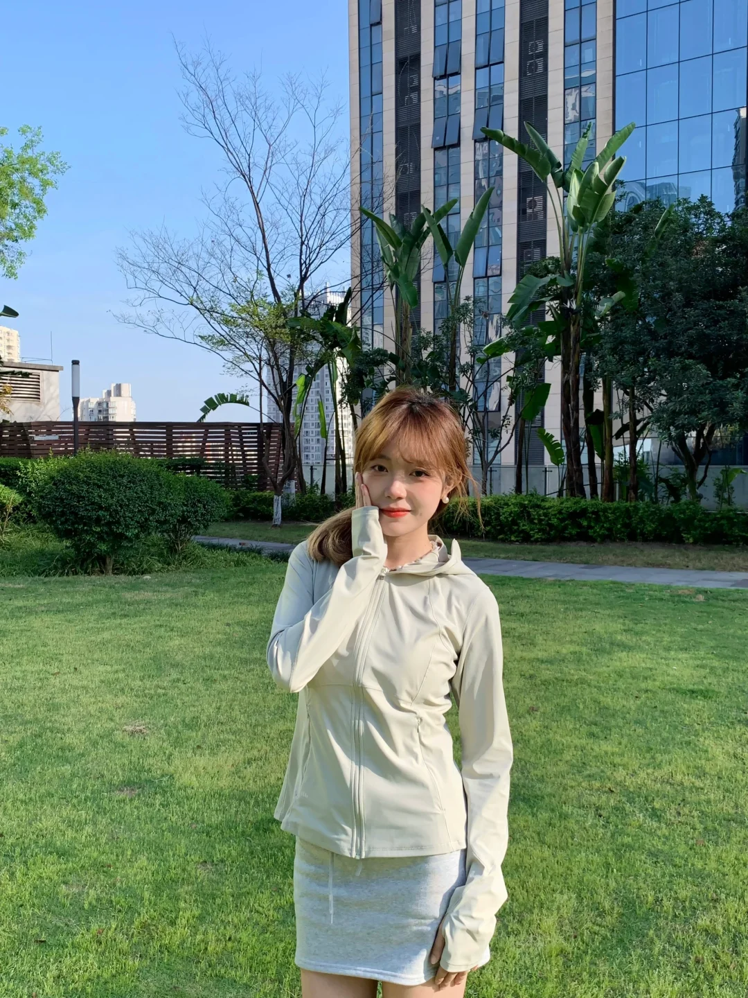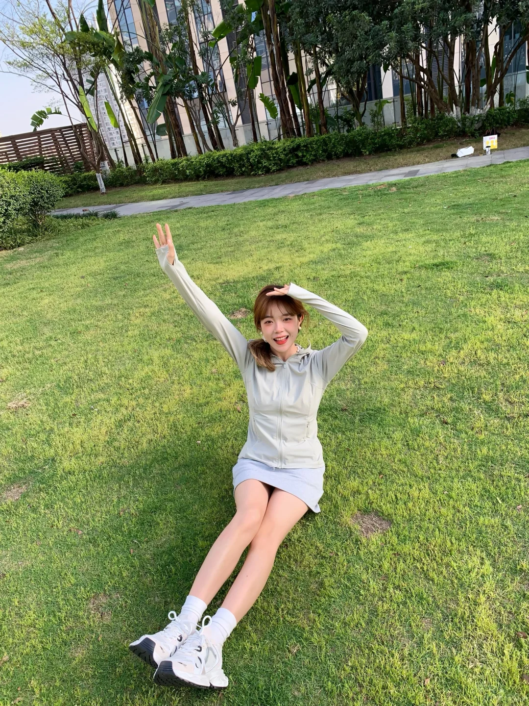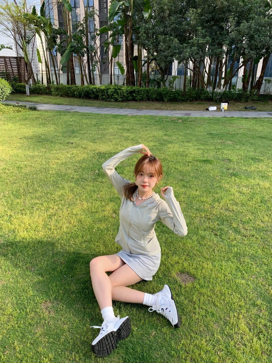 搭配灰色短裙和运动鞋