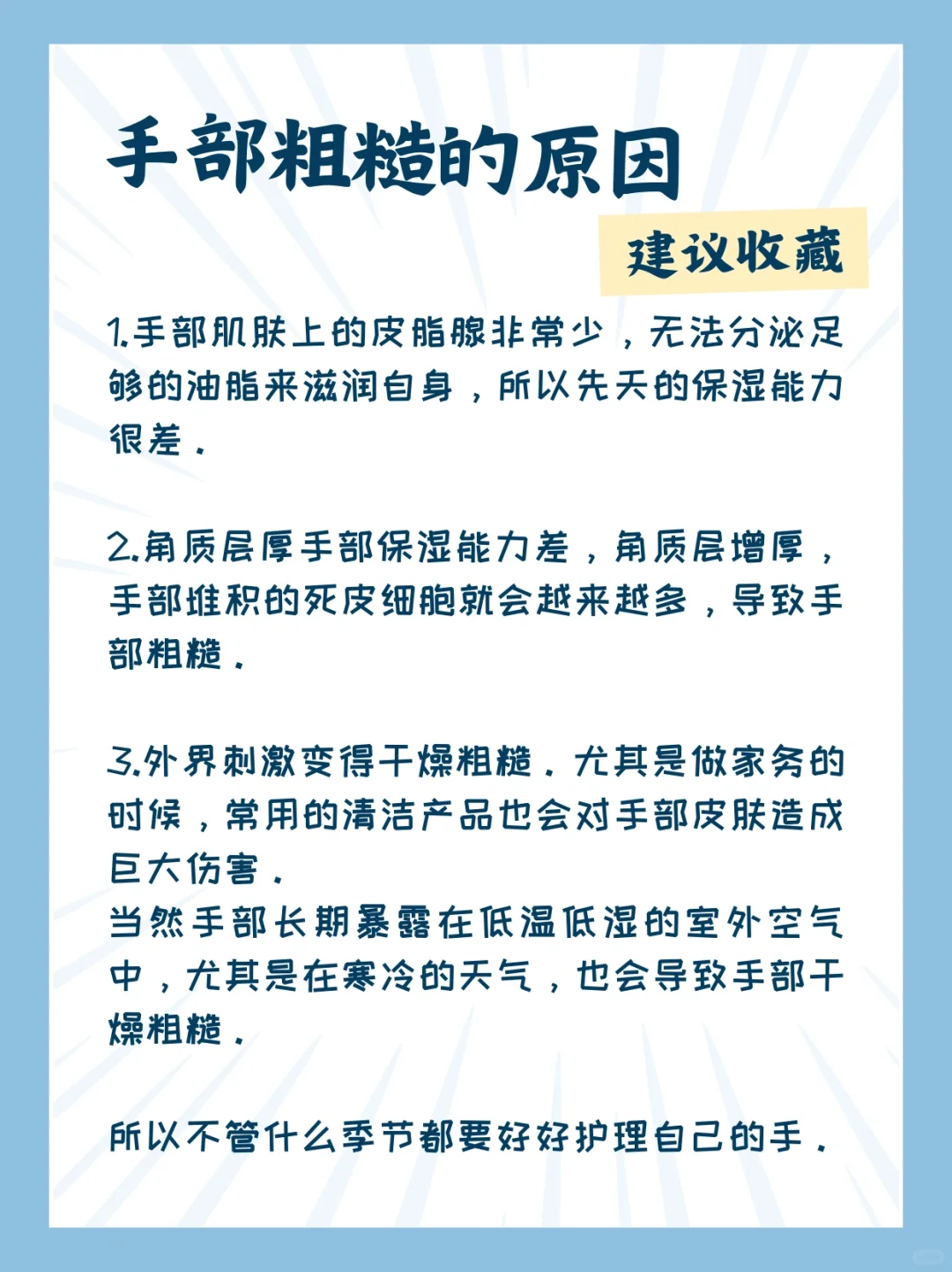 当然手部长期暴露在低温低湿的室外空气中,尤其是在寒冷的天气,也会导致手部干燥粗糙。