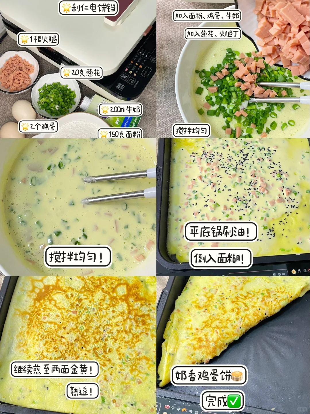 150克中筋面粉➕ 200ml牛奶➕2个鸡蛋🥚➕1根火腿 ➕20克葱花 ➕利仁电饼档
